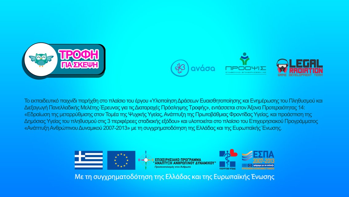 Το εκπαιδευτικό παιχνίδι παρήχθη στο πλαίσιο του έργου «Υλοποίηση Δράσεων Ευαισθητοποίησης και Ενημέρωσης του Πληθυσμού και Διεξαγωγή Πανελλαδικής Μελέτης-Έρευνας για τις Διαταραχές Πρόσληψης Τροφής», εντάσσεται στον Άξονα Προτεραιότητας 14: «Εδραίωση της μεταρρύθμισης στον Τομέα της Ψυχικής Υγείας, Ανάπτυξη της Πρωτοβάθμιας Φροντίδας Υγείας, και προάσπιση της Δημόσιας Υγείας του πληθυσμού στις 3 περιφέρειες σταδιακής εξόδου» και υλοποιείται στο πλαίσιο του Επιχειρησιακού Προγράμματος «Ανάπτυξη Ανθρώπινου Δυναμικού 2007-2013» με τη συγχρηματοδότηση της Ελλάδας και της Ευρωπαϊκής Ένωσης.