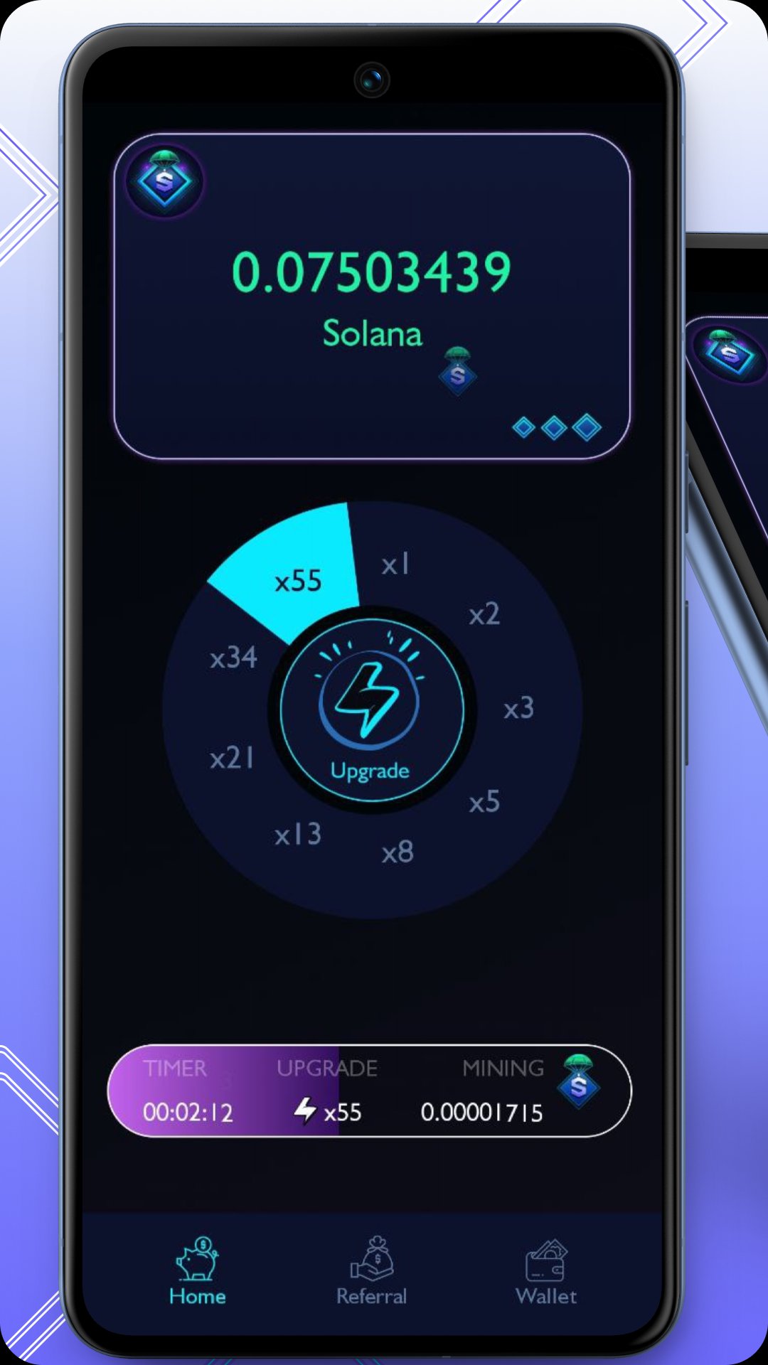 Stay active and earn regular Solana rewards through our cutting-edge blockchain technology. The app guarantees that you receive steady rewards without the need for intensive mobile mining.