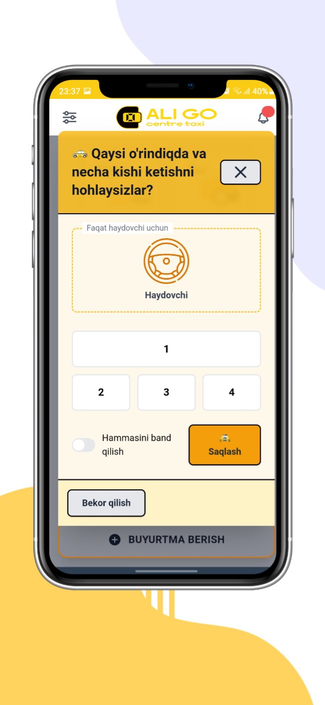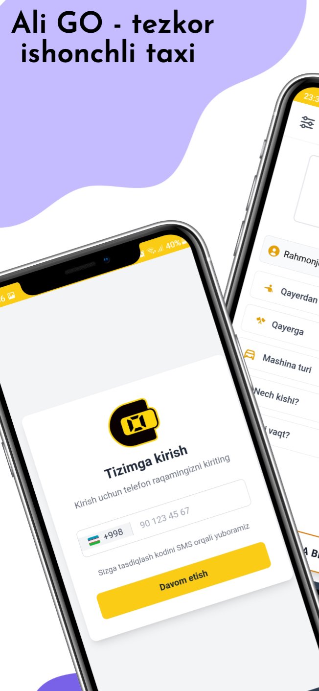 Ali GO – butun O‘zbekiston bo‘ylab taksi va pochta yetkazib berish xizmatlarini taqdim etuvchi zamonaviy ilova. Endi sayohat qilish yoki yuk yuborish yanada tez va oson!