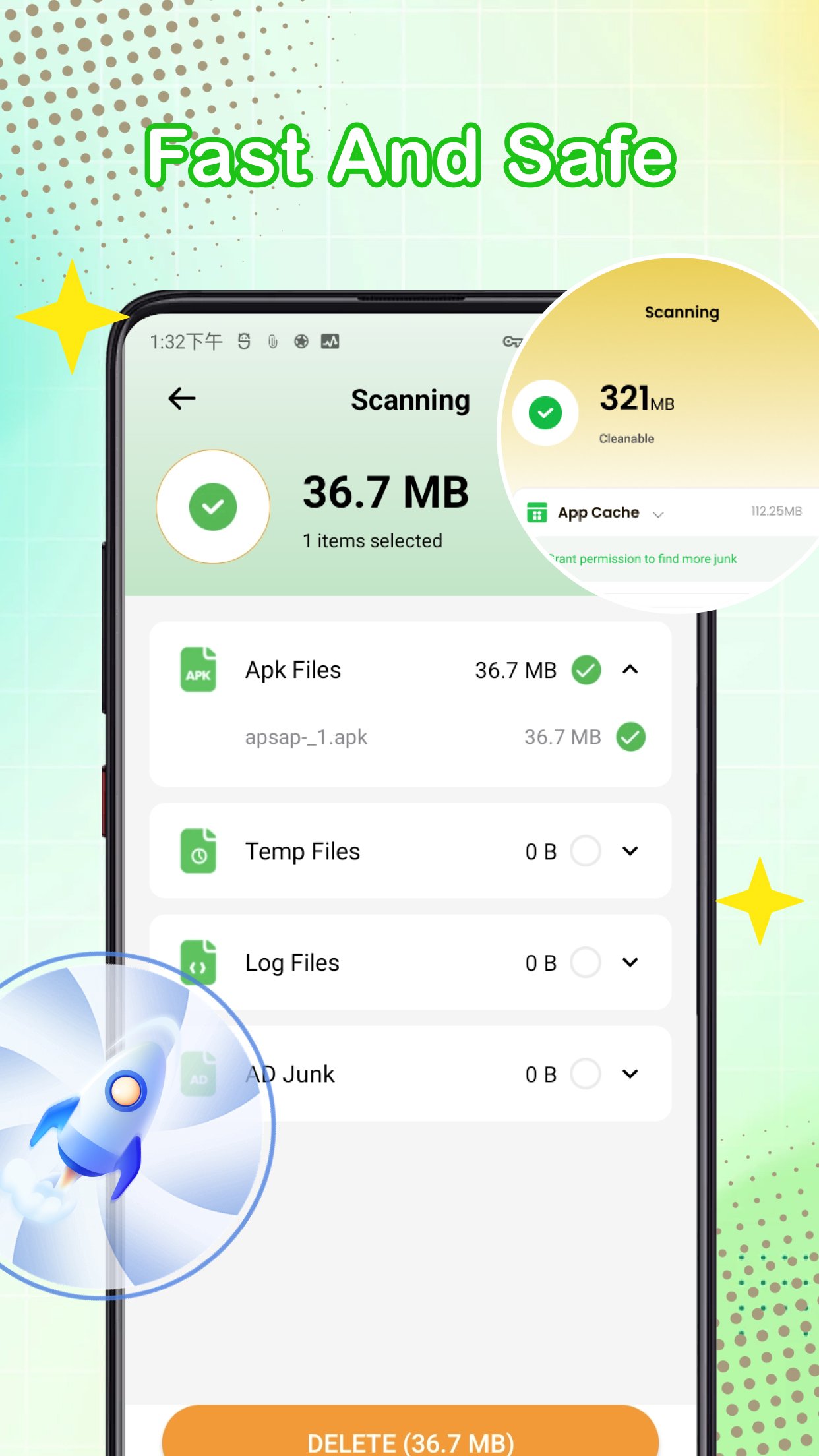 ►Scan and find large files: Scan files, quickly identify and help you delete large files, such as audio and video files.