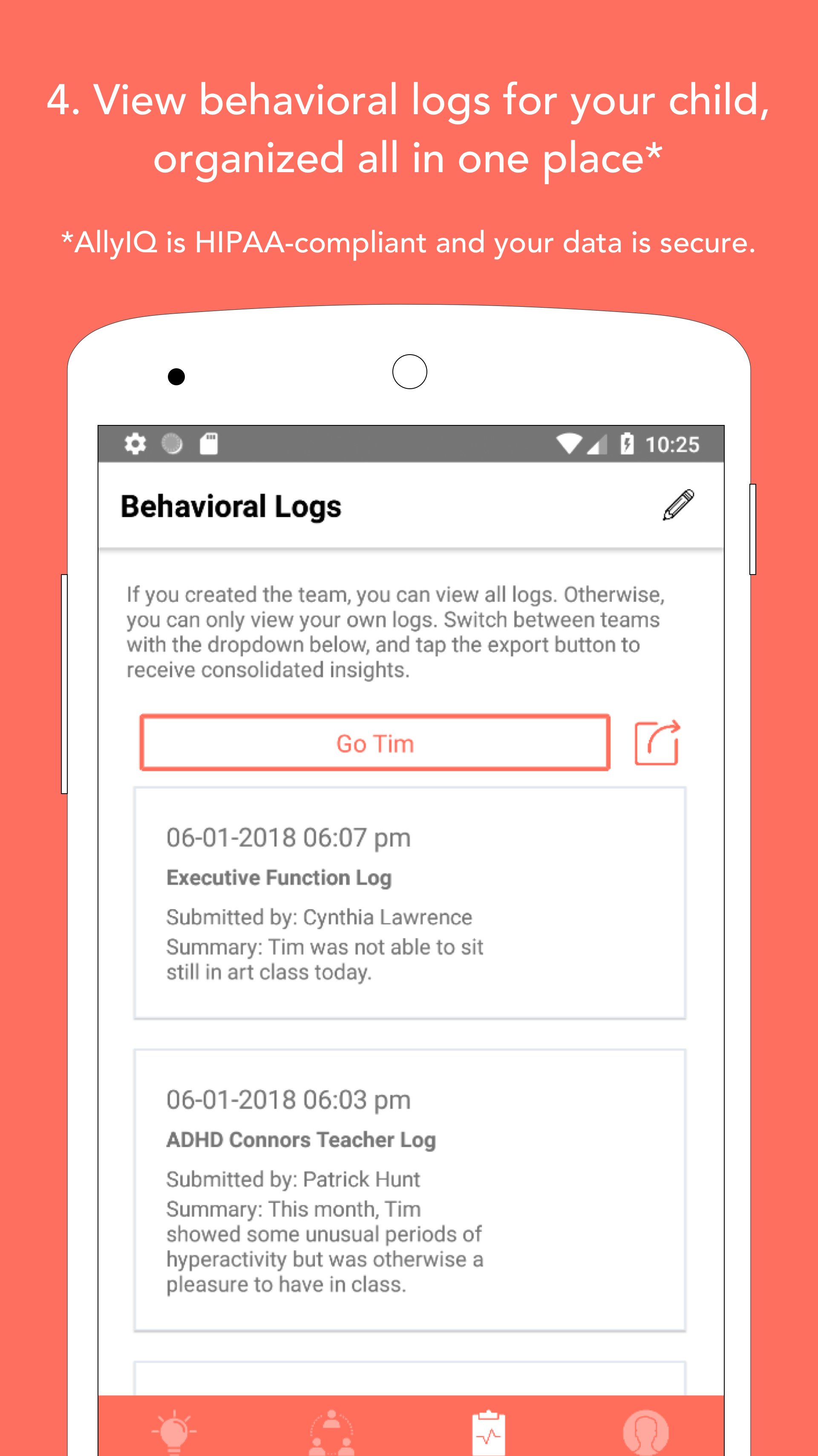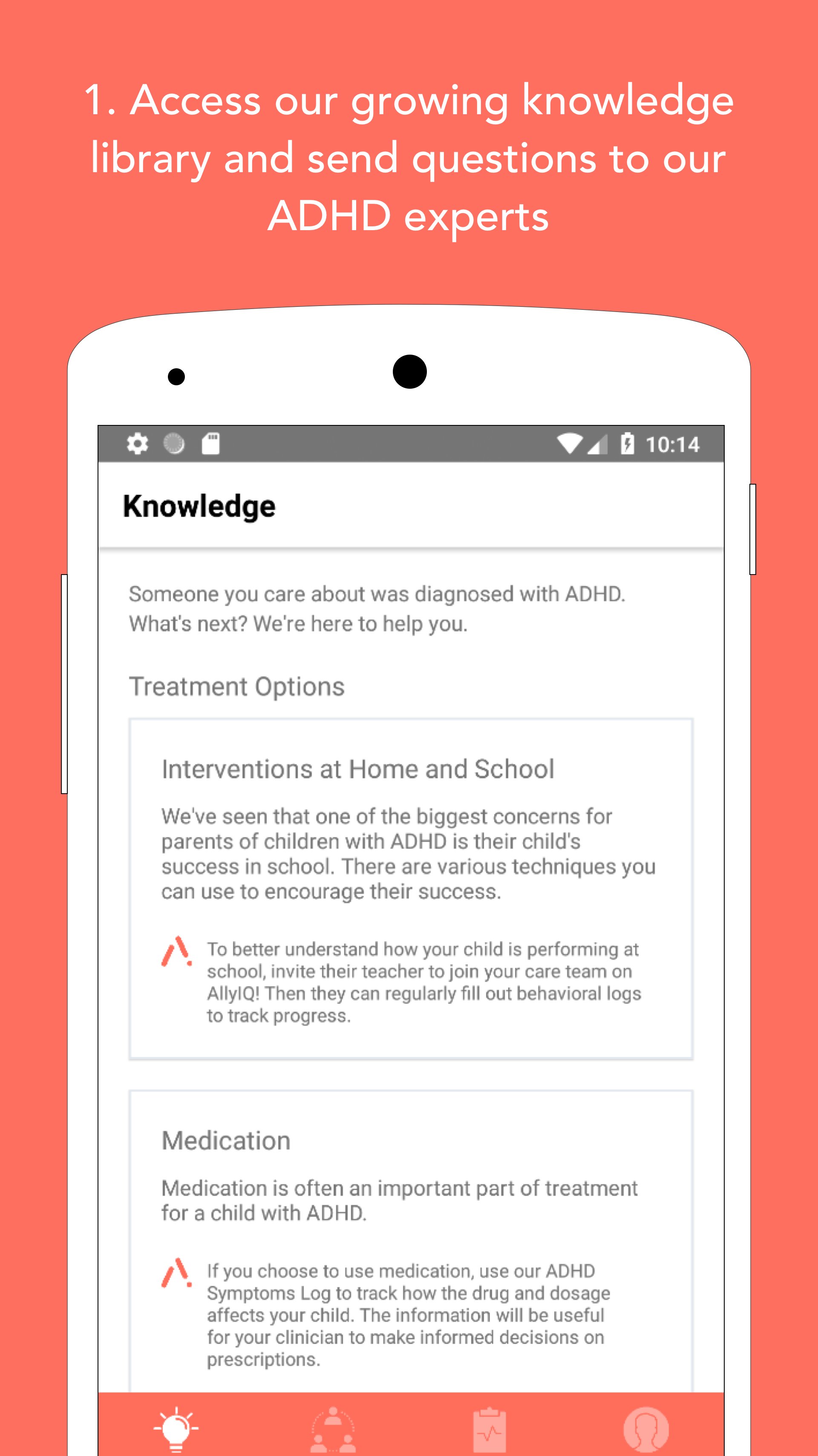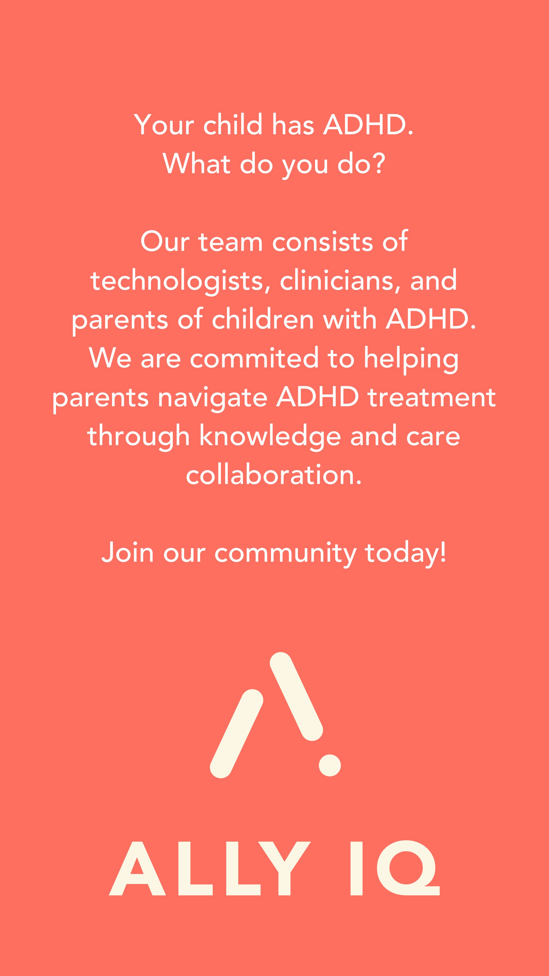 AllyIQ helps parents navigate the treatment process for children with mental health conditions such as ADHD. Parents can access our growing knowledge library, easily create a care team for their child, and invite individuals such as clinicians and teachers. Then, AllyIQ handles the logistics of collecting behavioral logs, providing invaluable knowledge about ADHD, and recommending actionable treatment steps. Join our community today!