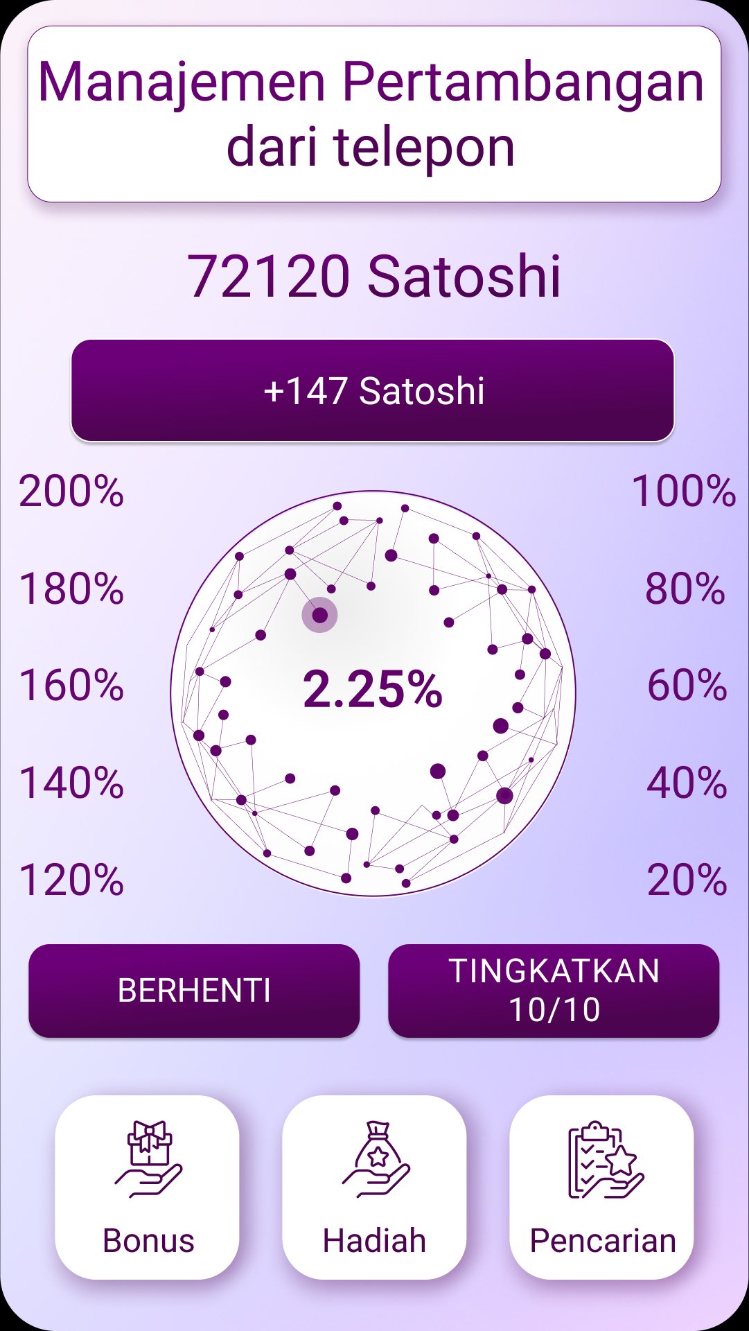Dengan bantuan aplikasi kami, Anda dapat menggunakan penambangan awan (mengontrol proses di server dengan ponsel Anda), merasa seperti bagian dari komunitas kripto orang-orang progresif. Periksa kemajuan aplikasi Anda secara teratur dan berinteraksilah dengannya setiap hari jika memungkinkan untuk hasil terbaik.