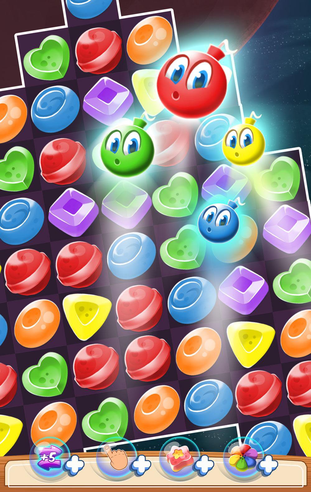 - Match 5 items in a row to get a special colorful candy bomb that can burst all figures with the same color.