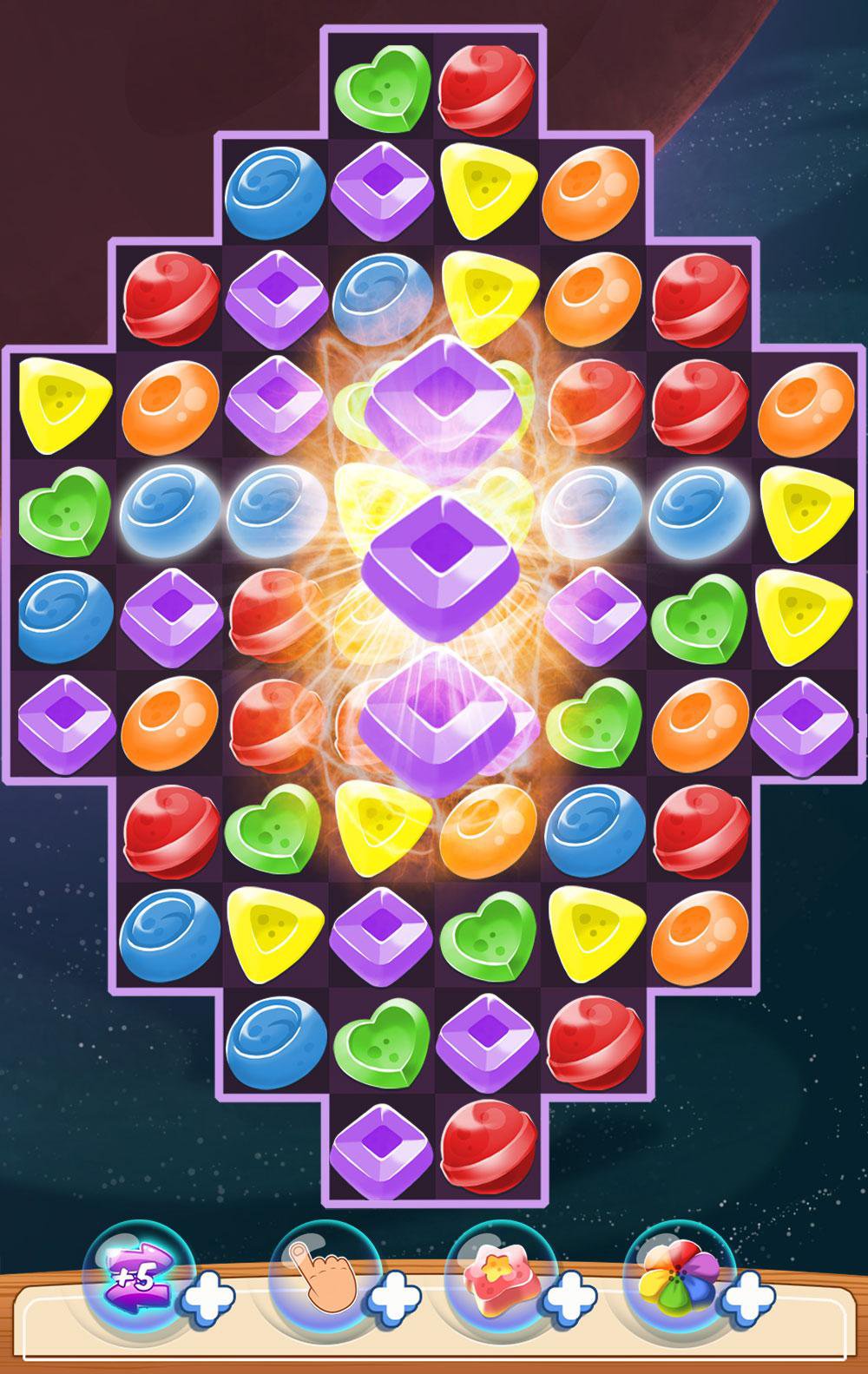 - Match 5 candy in an L or T form to get an amazing treat that will explode all items around it.