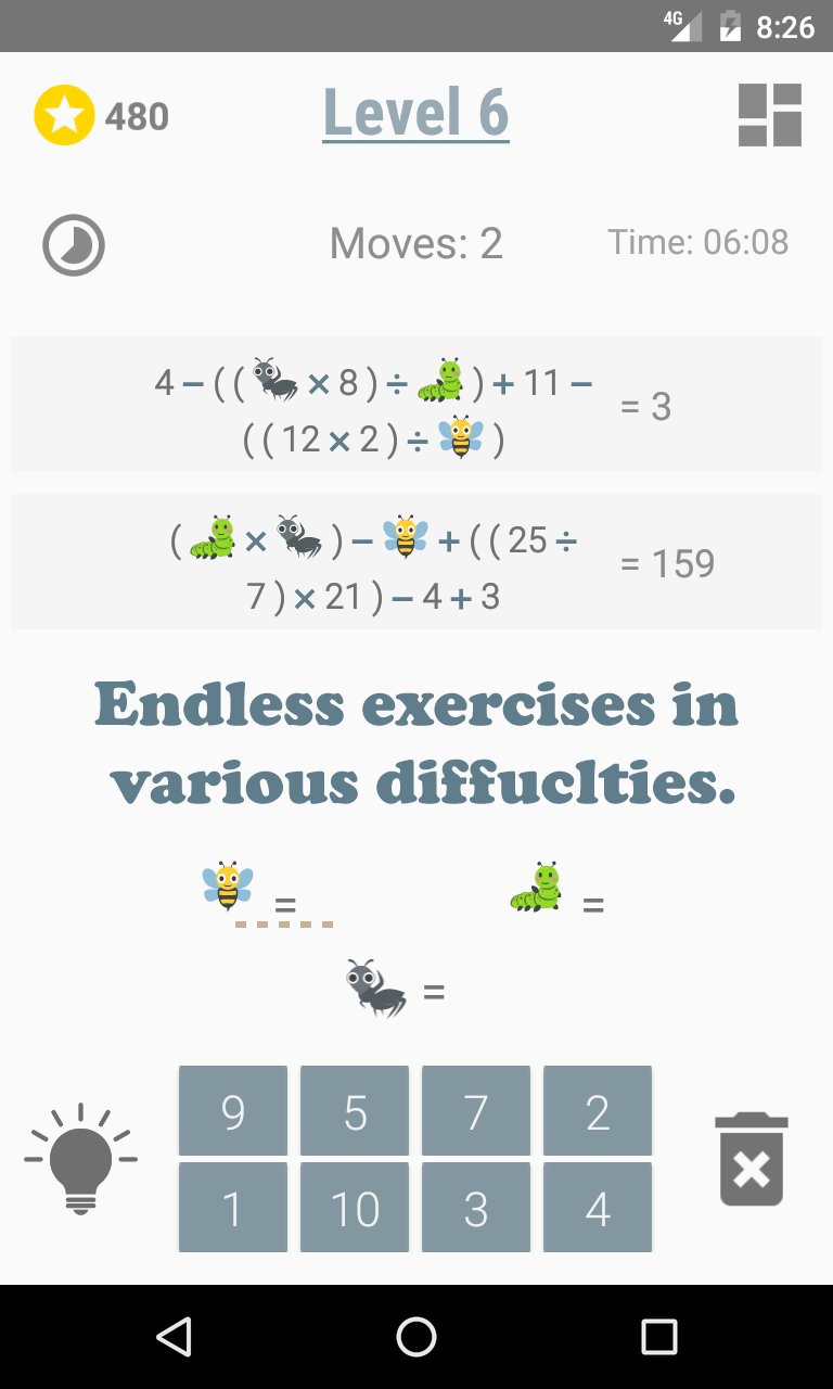 In each level exercise you will have a set of mathematical equations, each containing one, two, three or up to four and five variables each displayed as an emoji, which you need to find the number behind each of them with your calculations skills. Each exercise will challenge you to the max, by limiting you to a fixed time or a fixed set of moves (to avoid guessing). If you find yourself struggling with a set of equations or stuck with just one equation, you can quickly share it with your friends or family via FB or your smartphone share options. As you progress, you will find that calculating and solving linear equations becomes trivial and easy.