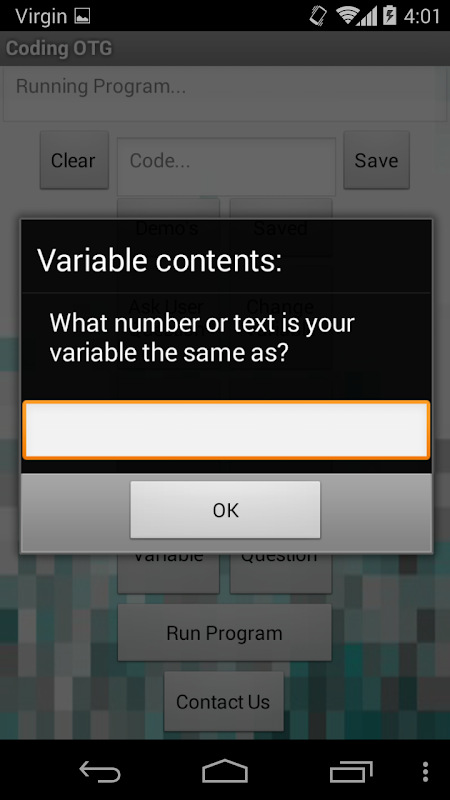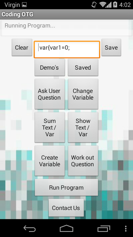 CodingOTG's design has been created with ease of use in mind. This is the case as CodingOTG uses a series of buttons with some text boxes to create its programs. CodingOTG uses a completely new coding language with some similarity's to C and Java.