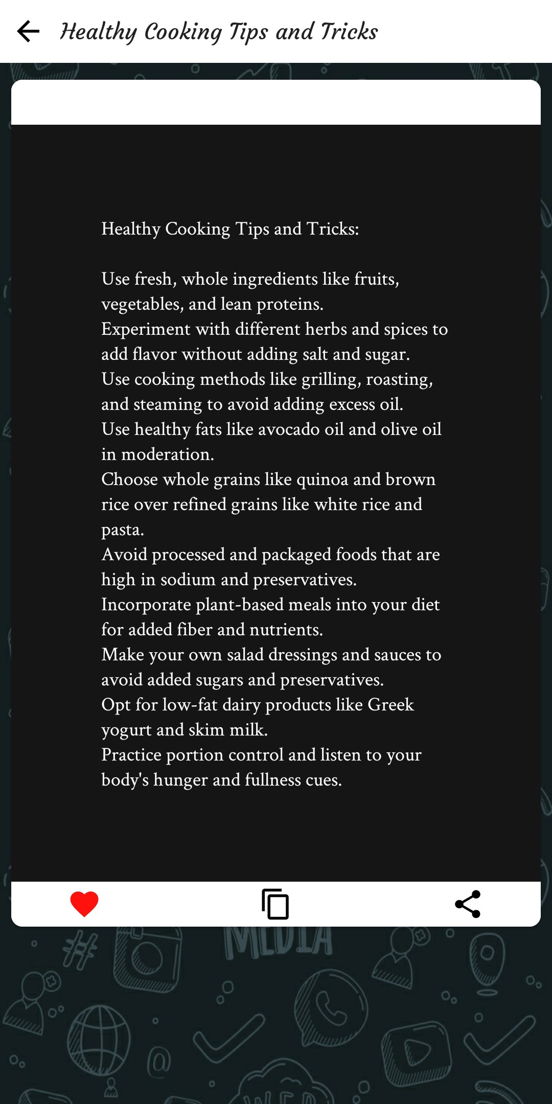 Cooking tips are suggestions or recommendations on how to improve the quality of your cooking. These may include techniques for preparing ingredients, following recipes, using appropriate kitchen tools, managing time and heat, and adjusting flavors as needed. By following cooking tips, you can enhance the taste, texture, and presentation of your dishes and become a better home cook