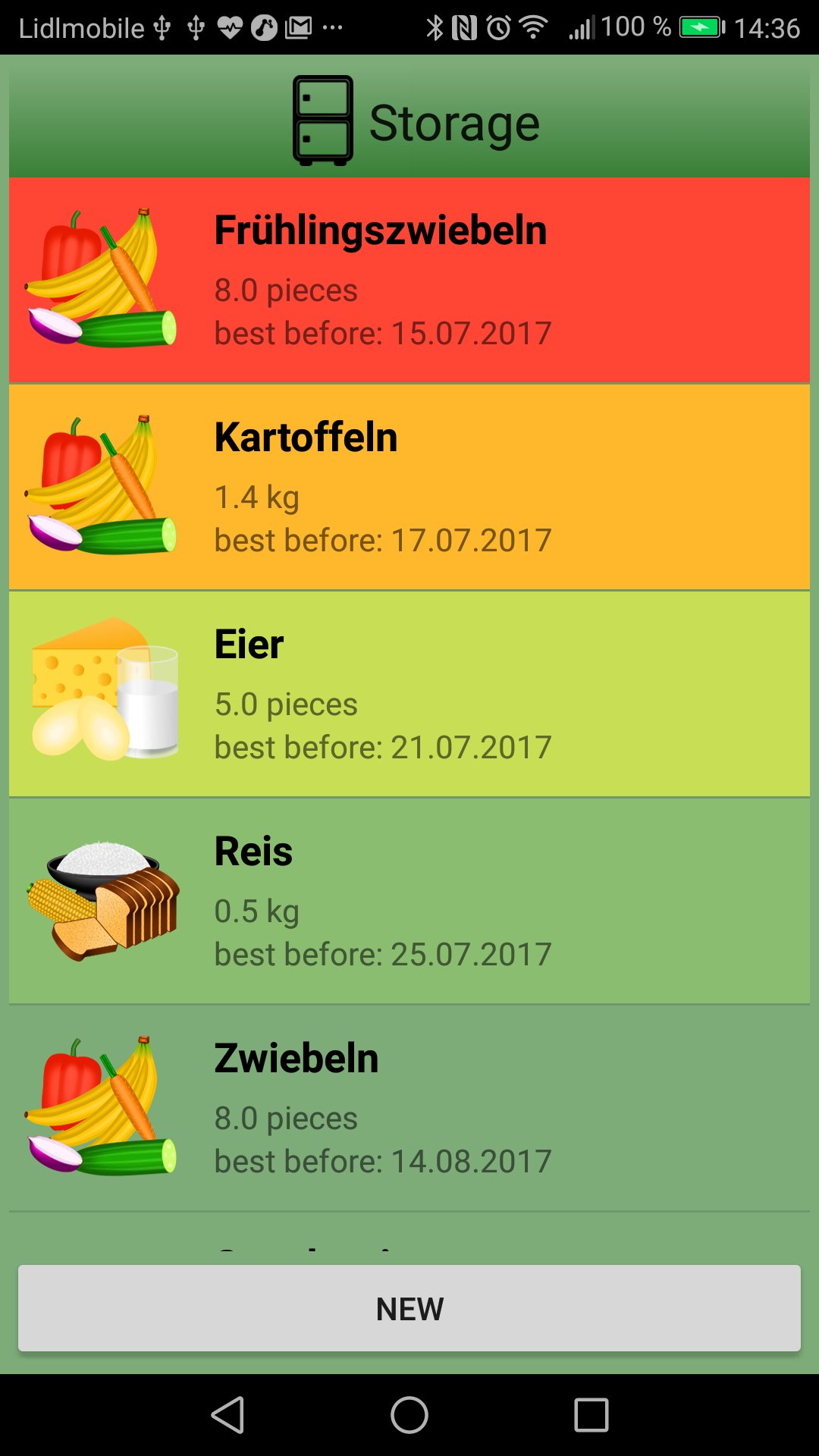1: STORAGE lists the cooking ingredients you have in storage. It gives the amount and indicates by color coding whether it is still well before the best by date or the expiring date is already near or over. Thus it helps to prevent food waste.