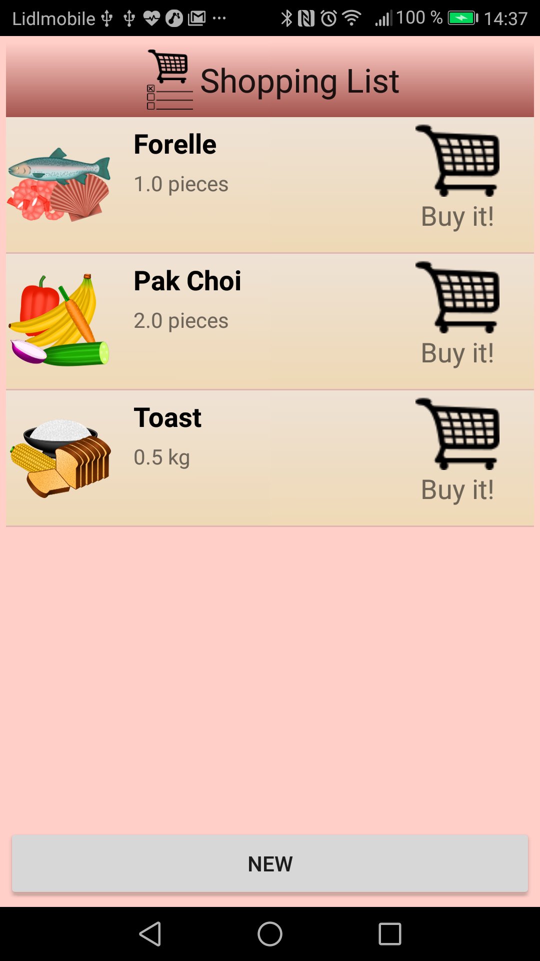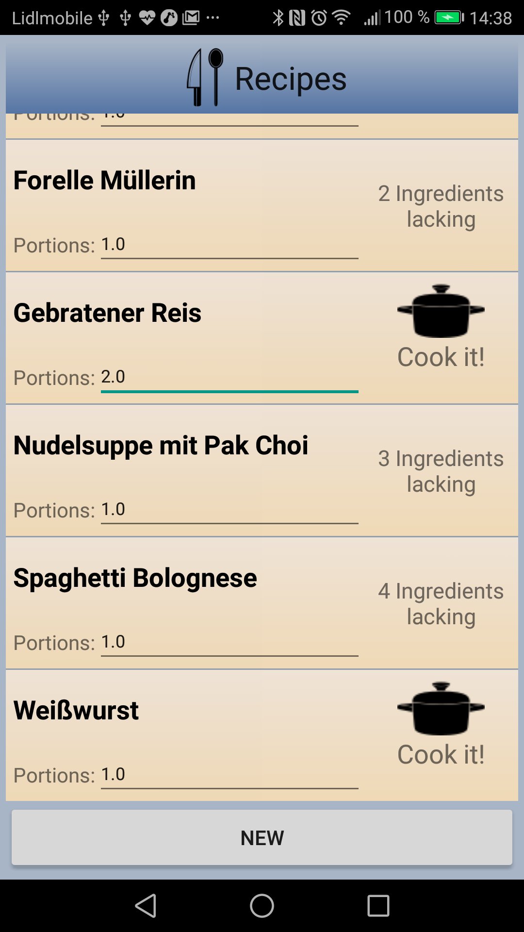 3: RECIPES holds your personal recipe book. The recipes are compared against storage and it is displayed whether cooking the recipes with ingredients in stock is possible. If not it gives the number of food items to buy. With enough ingredients in the storage pressing the 'Cook it!' button will display the recipe for cooking and finally adjust consumed food items in the storage. With missing ingredients the app will forward you to a menu where you can put the lacking ingredients to the shopping list which you can use for grocery shopping. Both functions allow for a flexible adjustment of portions or change of amount of individual ingredients.