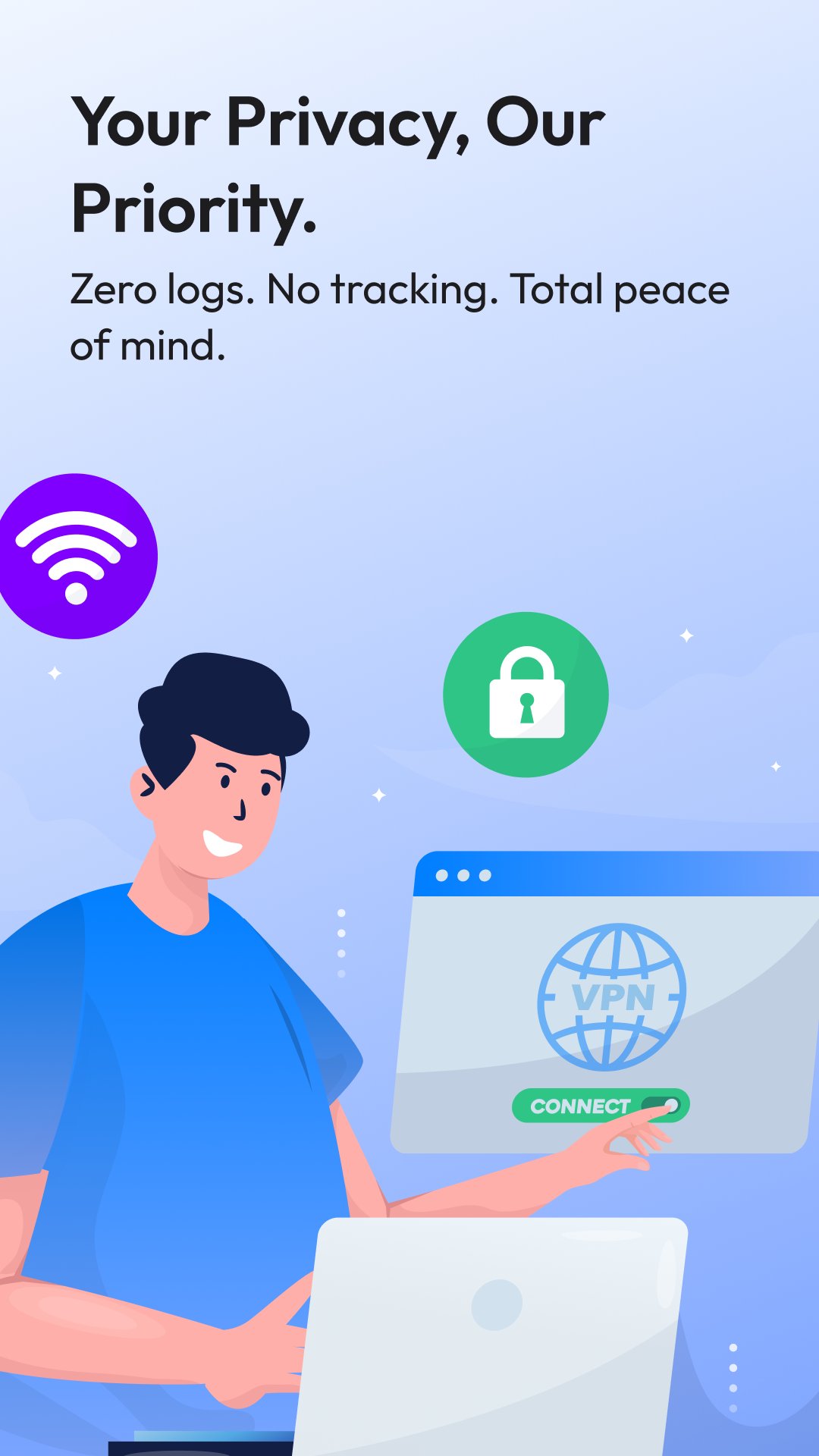Connect instantly with one tap. No account, no email, no phone number. Perfect for users who want instant privacy without friction.