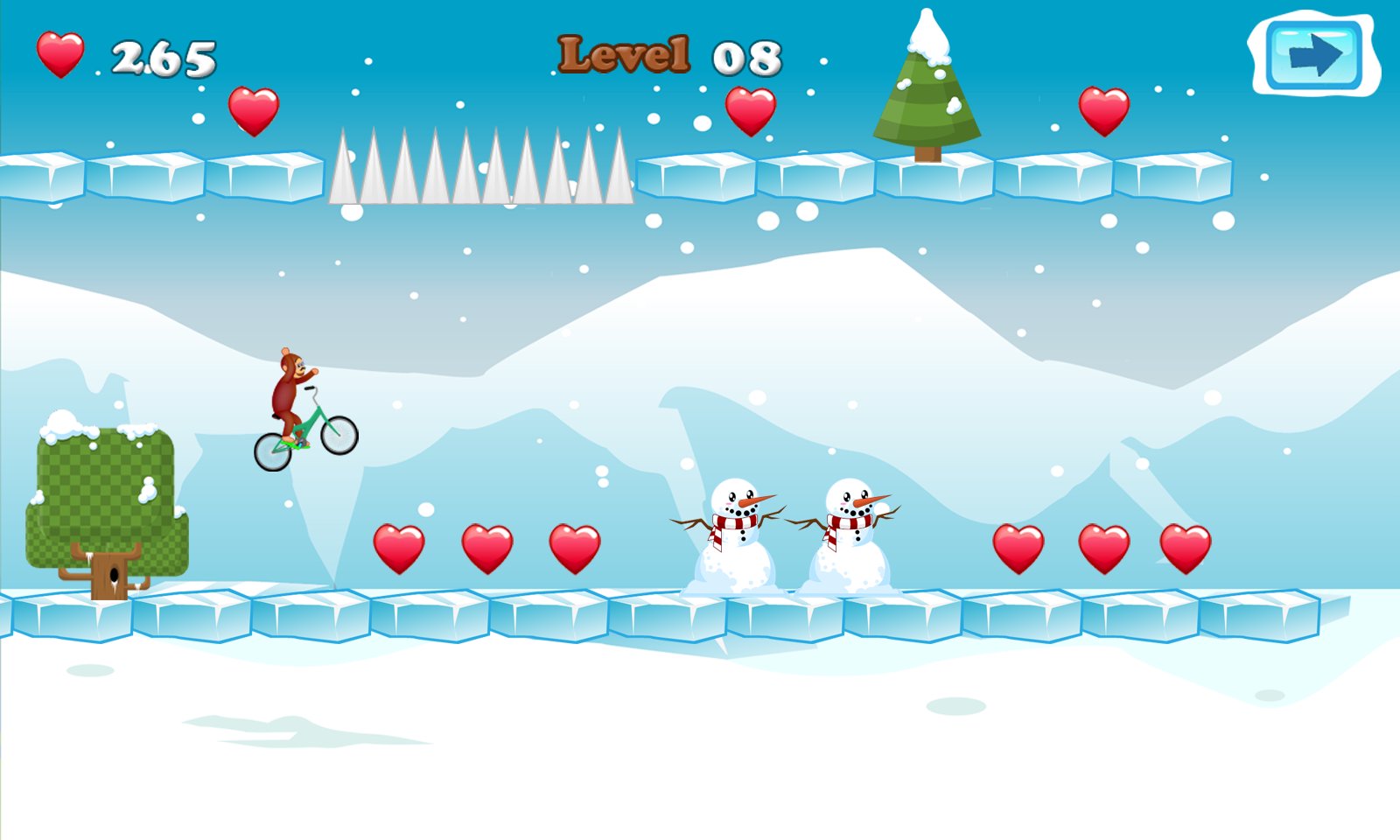 Go biking in the new adventures of the curious monkey at the snow worlds for escaping!