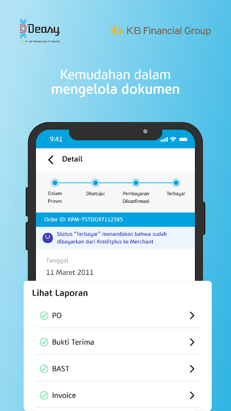 Deasy Mobile is an innovative mobile-based loan service application used by PT KB Finansia Multi Finance with the Kreditplus brand. You can use Deasy Mobile to submit financing applications that will be taken by Kreditplus consumers by using the Snap and Buy method through QR code scan process, it also can be used to upload and download documents from the Kreditplus merchant and real-time monitoring transaction status.