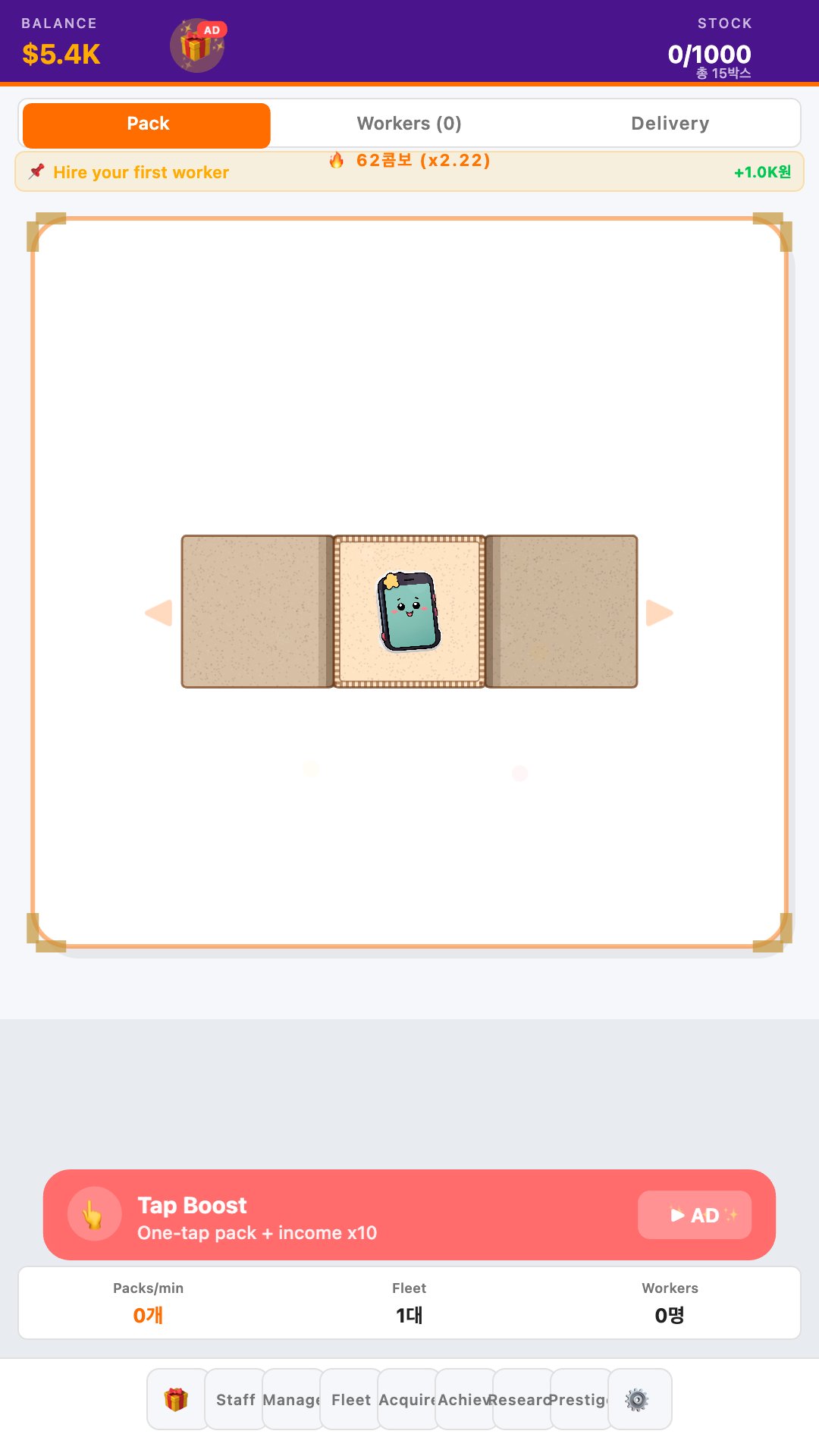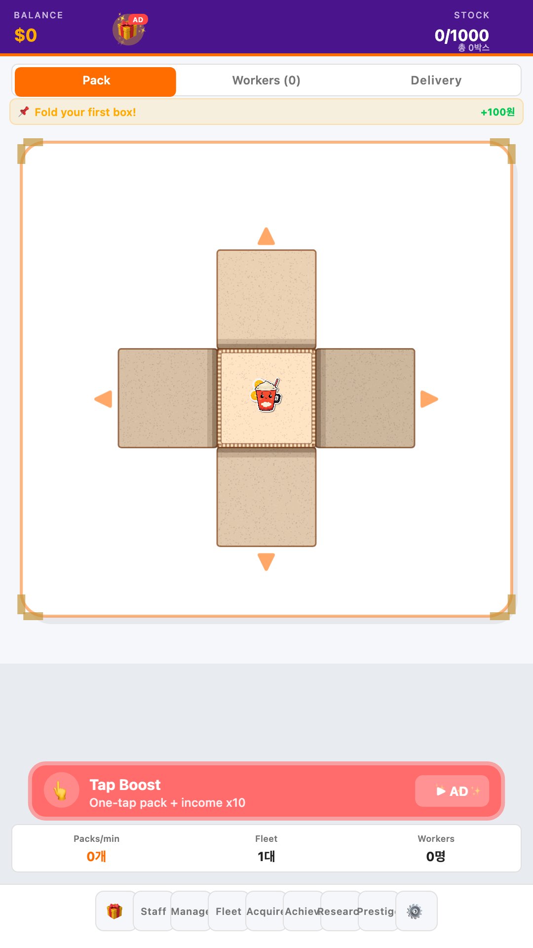 Start your delivery business from scratch! Tap to fold boxes, pack items, and ship them out.