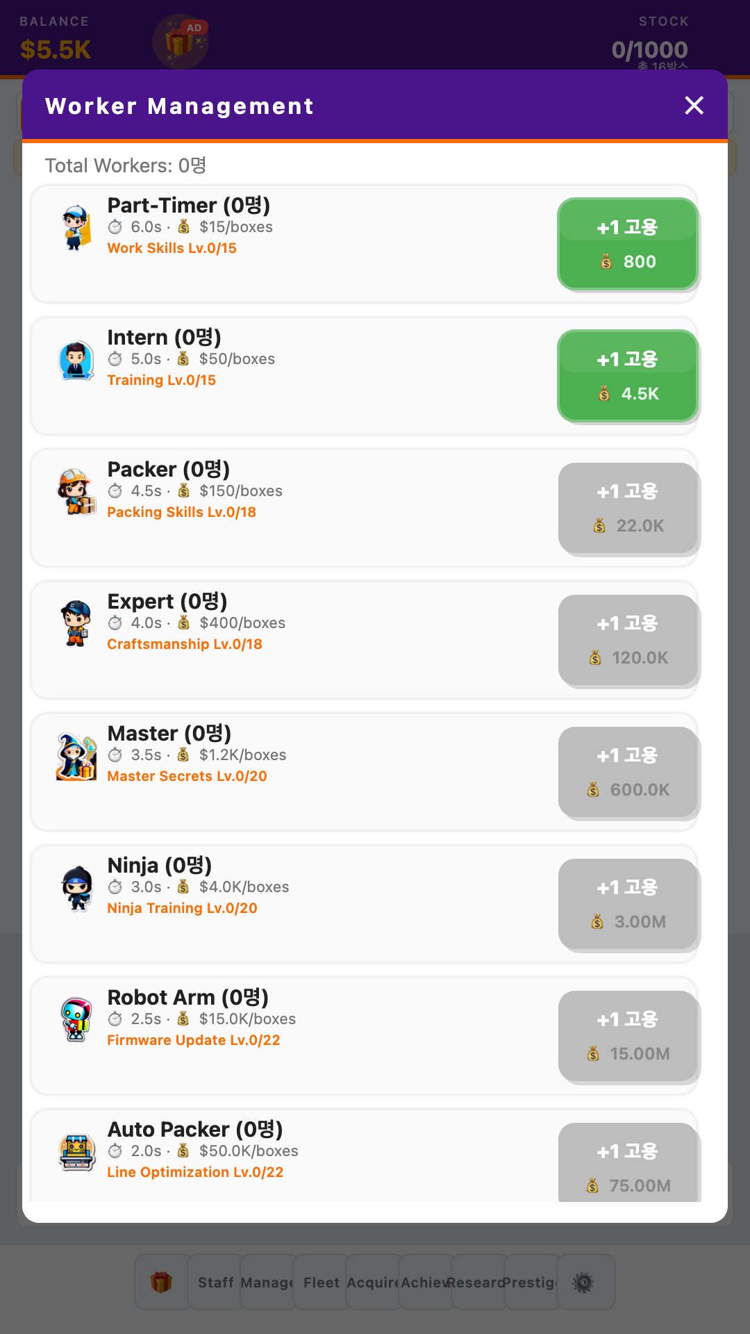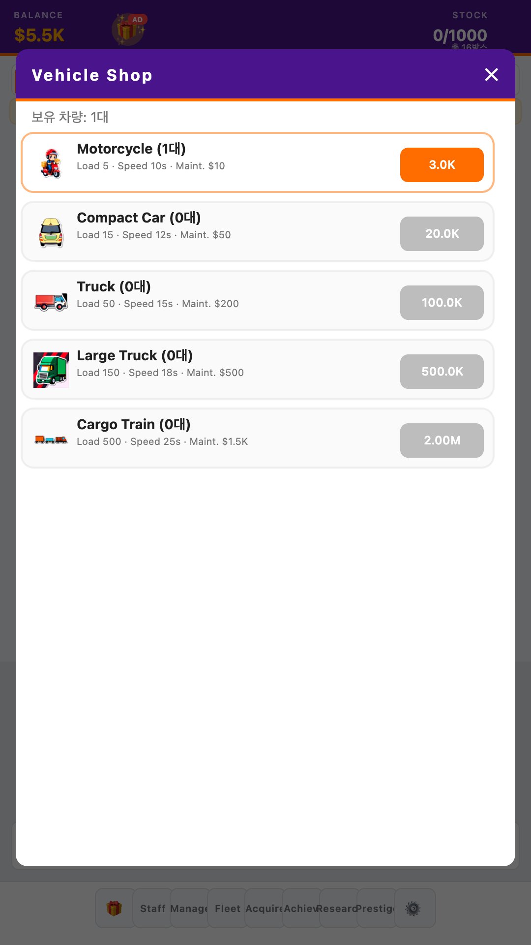Purchase delivery vehicles from bikes to cargo trucks. Expand your delivery routes to earn passive income around the clock.