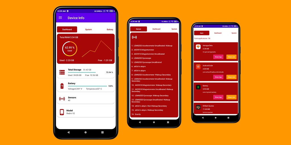 📱Device Info (2023) is a best Android application that gives you complete information about your mobile phone with advanced UI and widgets. For example,📱Device Info and mobile phone Info includes information about RAM, Sensors, Storage,🔋Battery, Model, Apps etc.Better performance and battery life.You can optimize your mobile device time to time checking optimizations.📱Device info app trying provide maximum information as possible