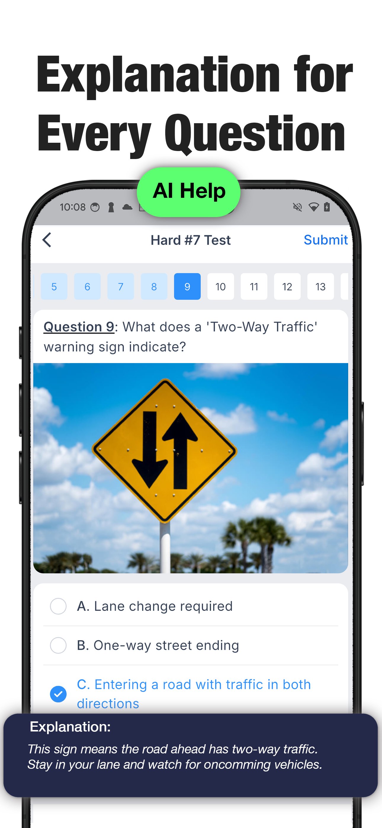 Instantly scan and learn any traffic sign using your camera. Get real-time information, explanations, and tips. The AI Coach also answers your questions about signs, test items, and study materials – anytime you ask.