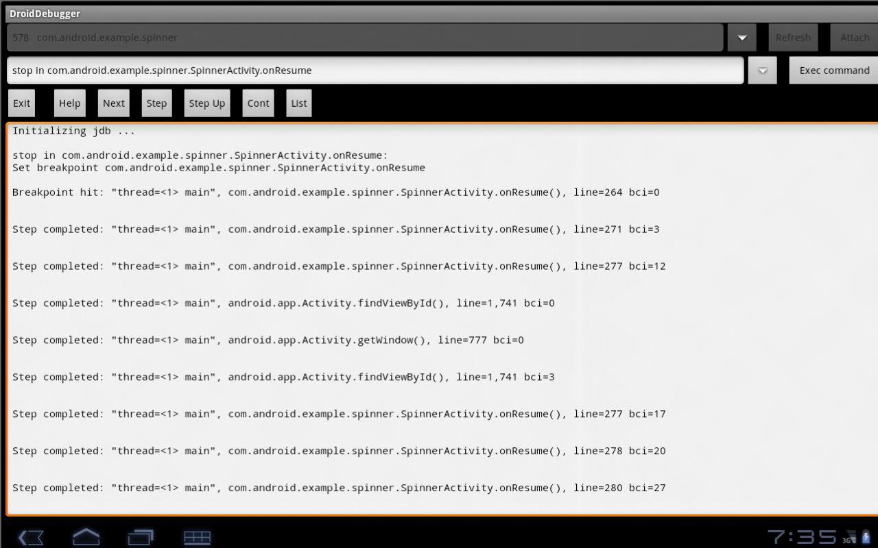 Using various JDB commands - http://droiddebugger.blogspot.com/2012/05/droiddebugger.html