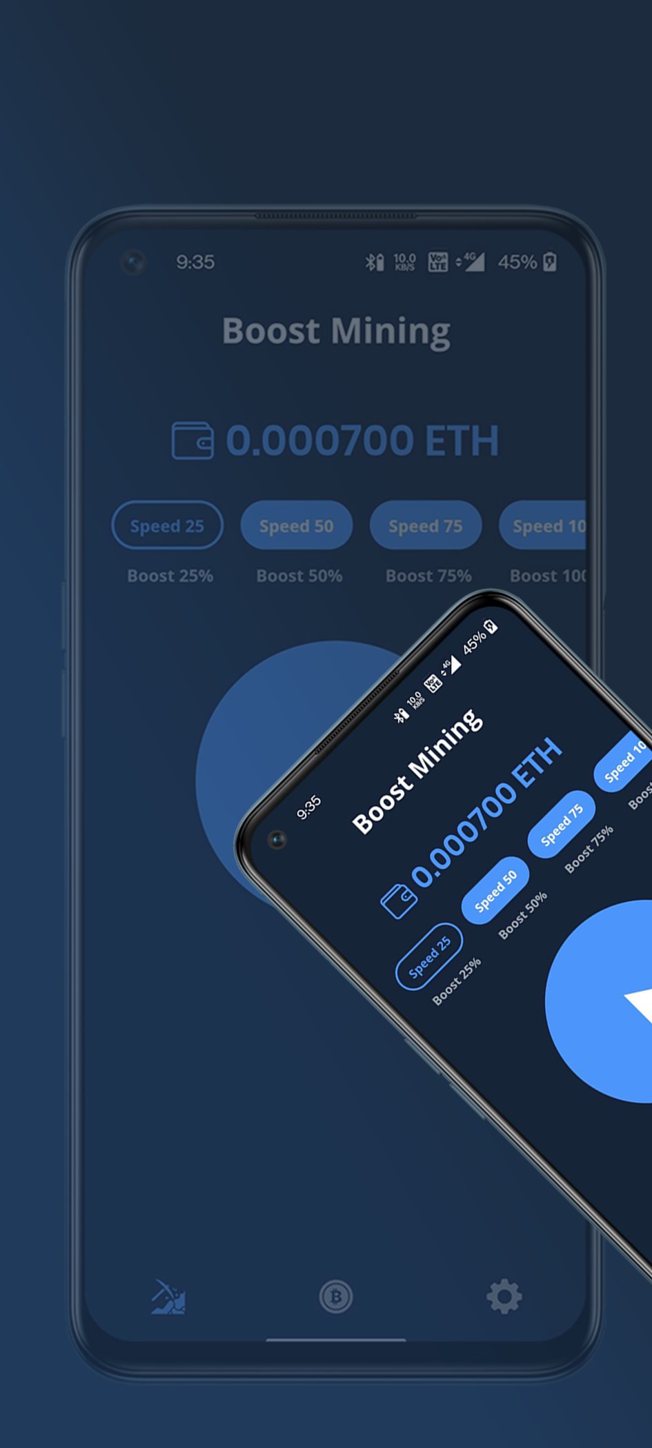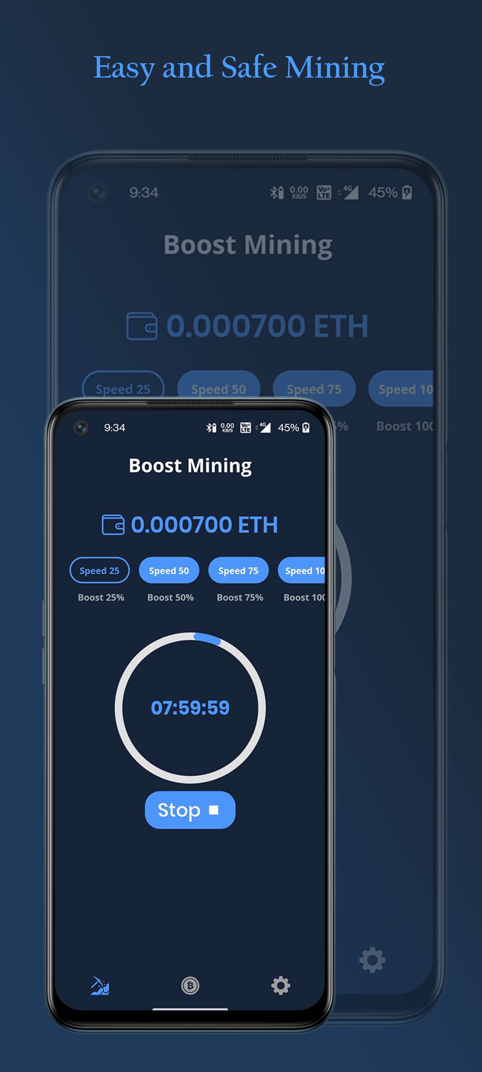 Start ETH mining(Miner) immediately with our ETH mining app. Your device will keep mining in the background even if you minimize your app and lock the phone.