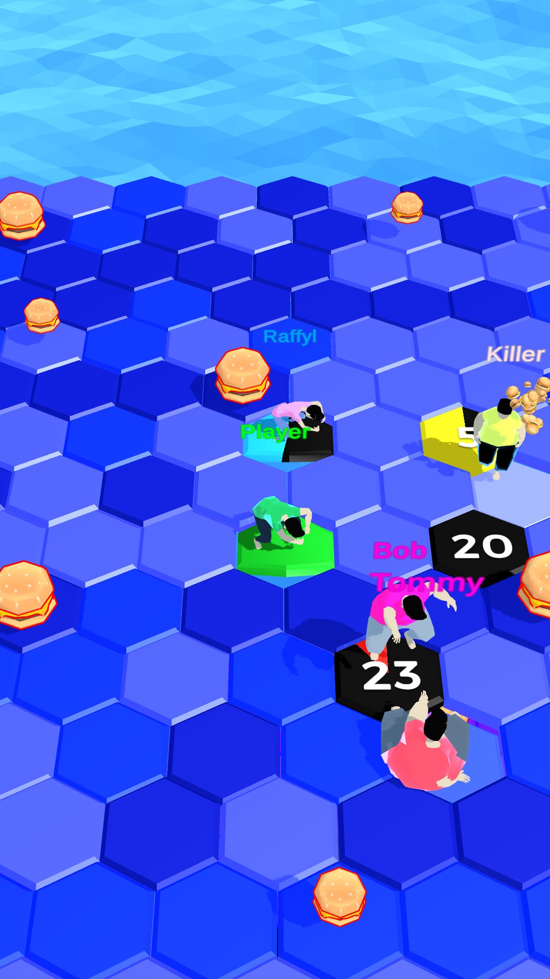 Your task is to collect burgers and reach the bottom platform first. But you're not the only one with the same task. You have other enemies who are also eating burgers. You must defeat them all! To become the champion, you need to break through all the platforms on the floors faster!