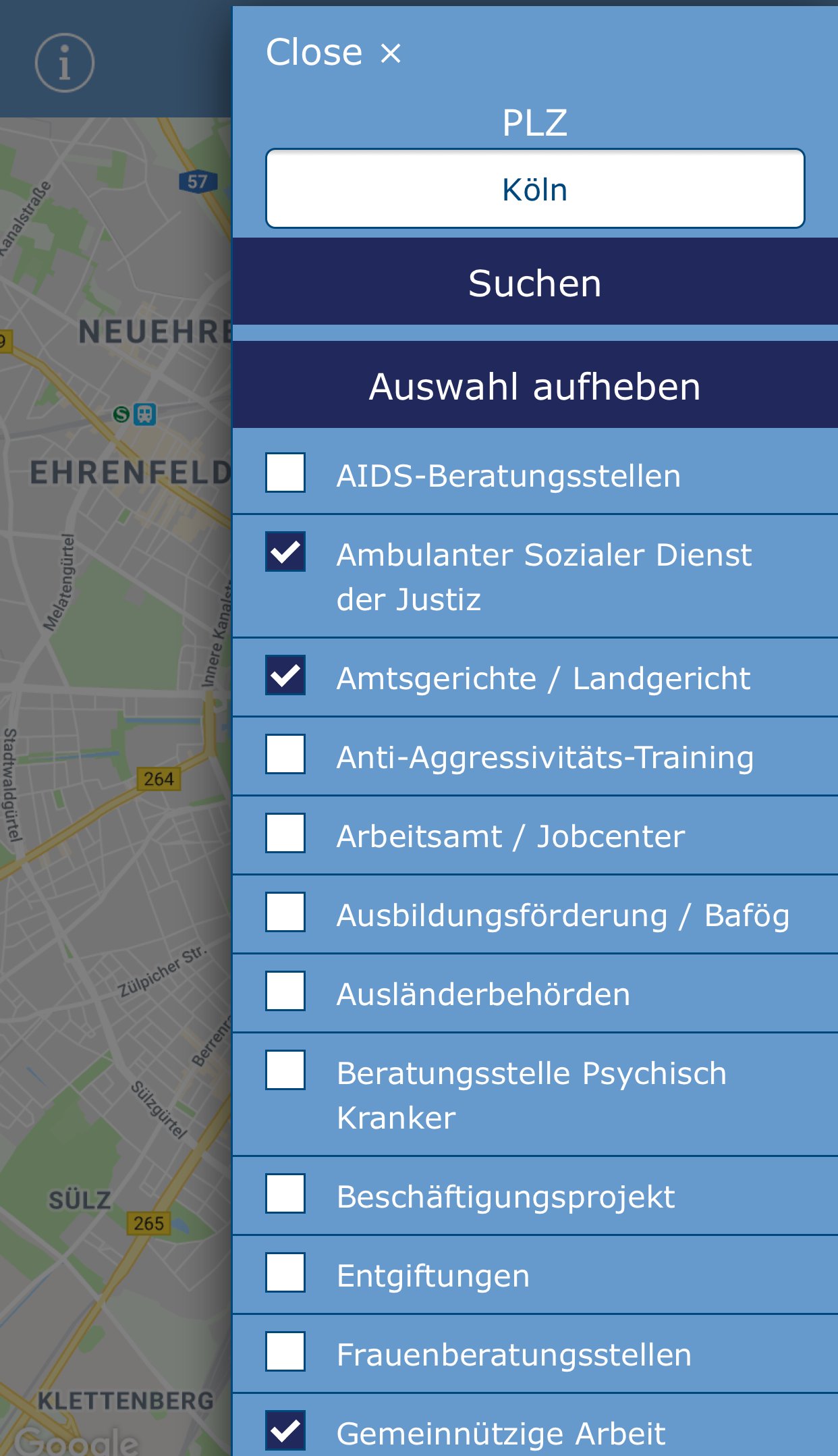 Sie suchen professionelle Hilfe und Unterstützung bei ihren persönlichen Problemen im Kölner Landgerichtsbezirk? Der Förderverein der Bewährungshilfe Köln e.V. hilft Ihnen bei der Suche von Hilfseinrichtungen wie zum Beispiel Schuldnerberatungsstellen, Suchthilfen, Wohnungslosenhilfen, Job Centern usw. Nachdem Sie für sich die geeignete Einrichtung gefunden haben, erhalten Sie die wichtigsten Informationen und können sich einfach via Google Maps dorthin navigieren lassen.