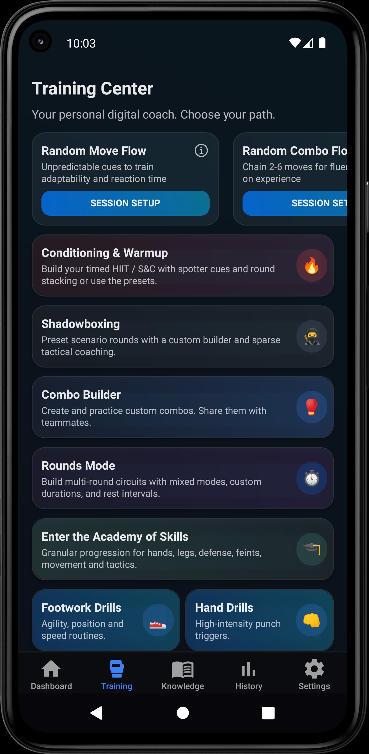 FightFlow includes multiple ways to train boxing, kickboxing, and Muay Thai solo: