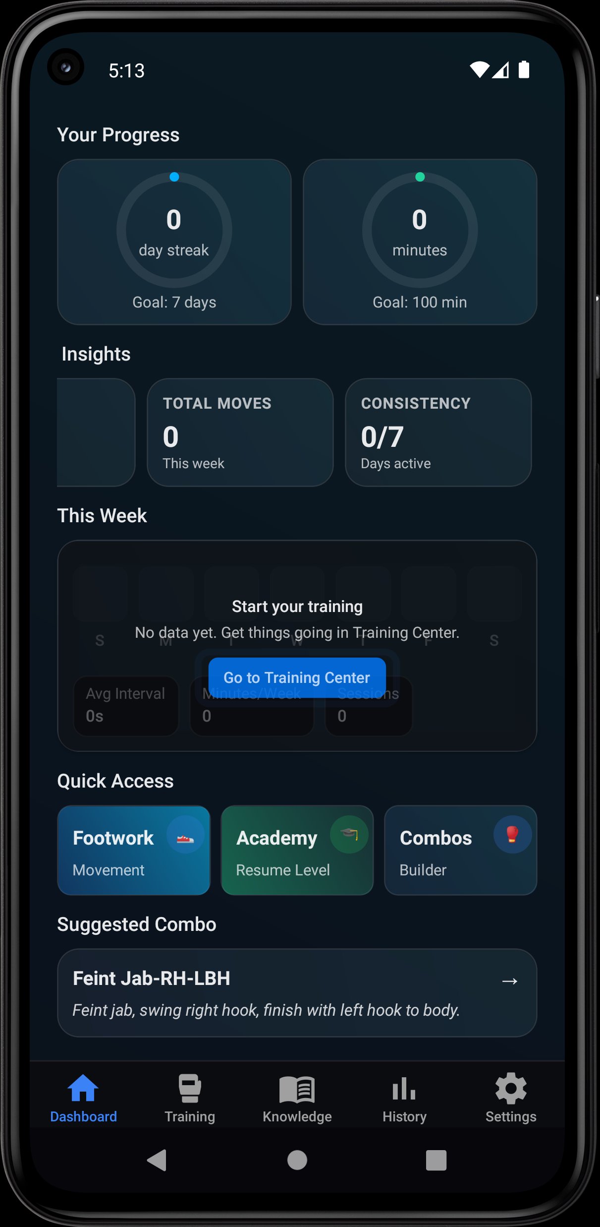 No partner. No coach. No hardware. Just start a round and react.