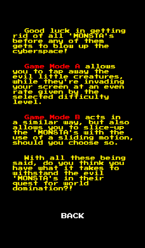 - Challenge yourself as you try various difficulty levels and watch the score go higher and higher for each eliminated MONSTA, depending on how much you can endure;