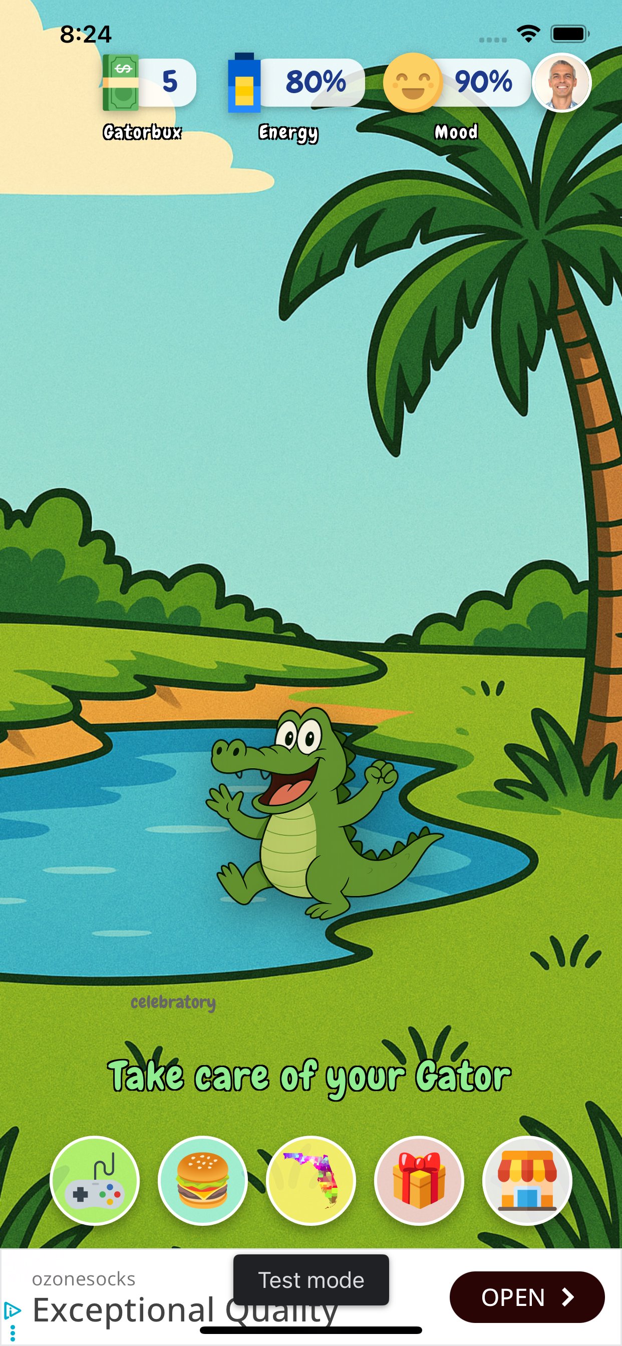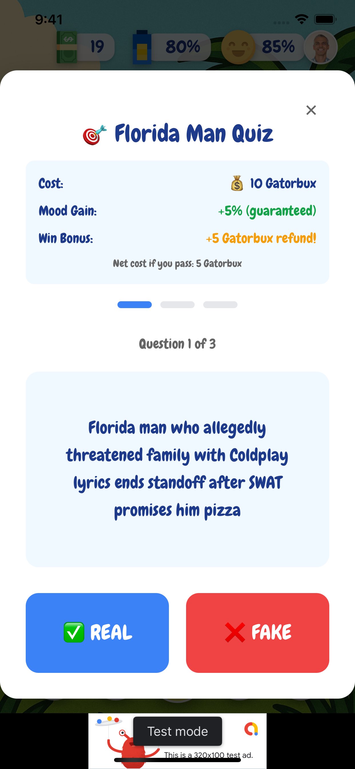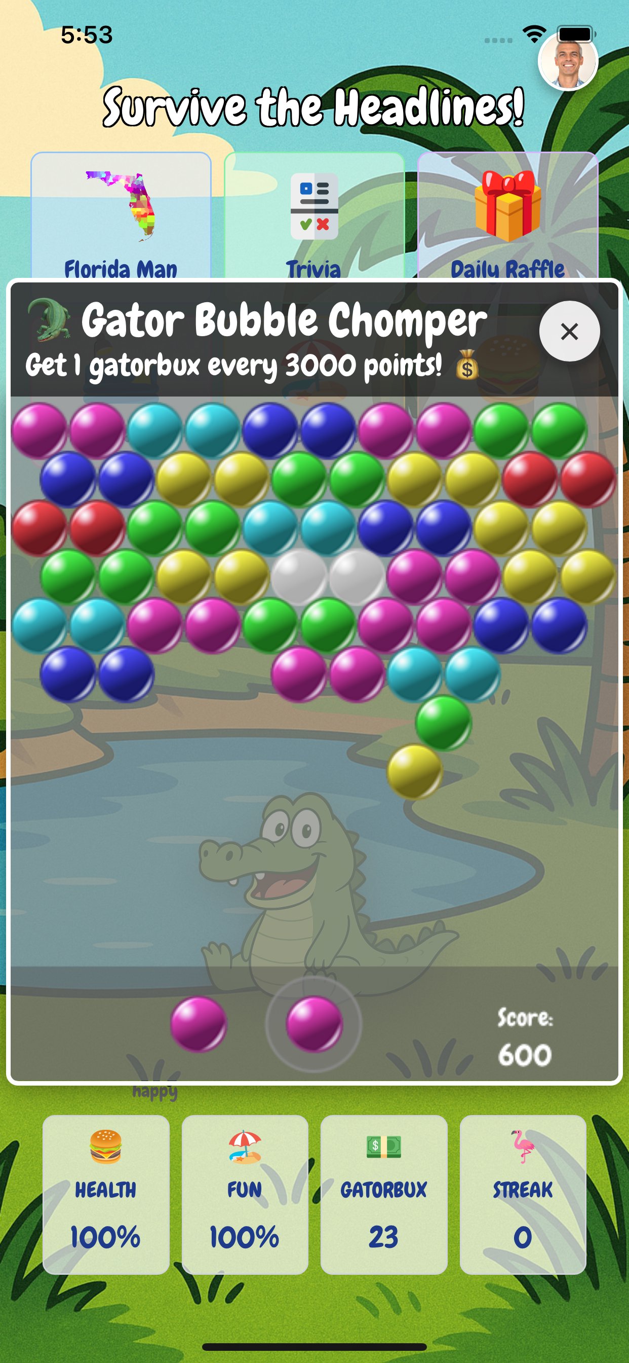 Your mission: help the Gator survive the chaos of real (and sometimes unbelievable) Florida news stories. Each headline affects your Gator’s mood and health — can you keep him happy and thriving in the land of sunshine and madness?