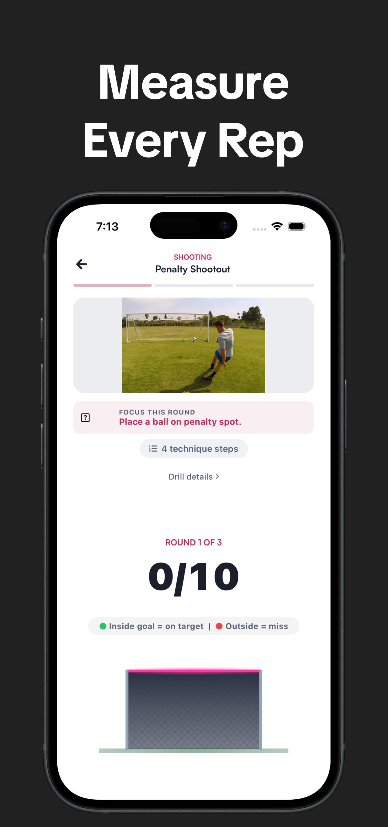 Train across Control, Passing, Shooting, Defending, Fitness, and Goalkeeping. Each category features guided drills with video demonstrations, difficulty ratings, and clear instructions. Complete your first drill in under 5 minutes.