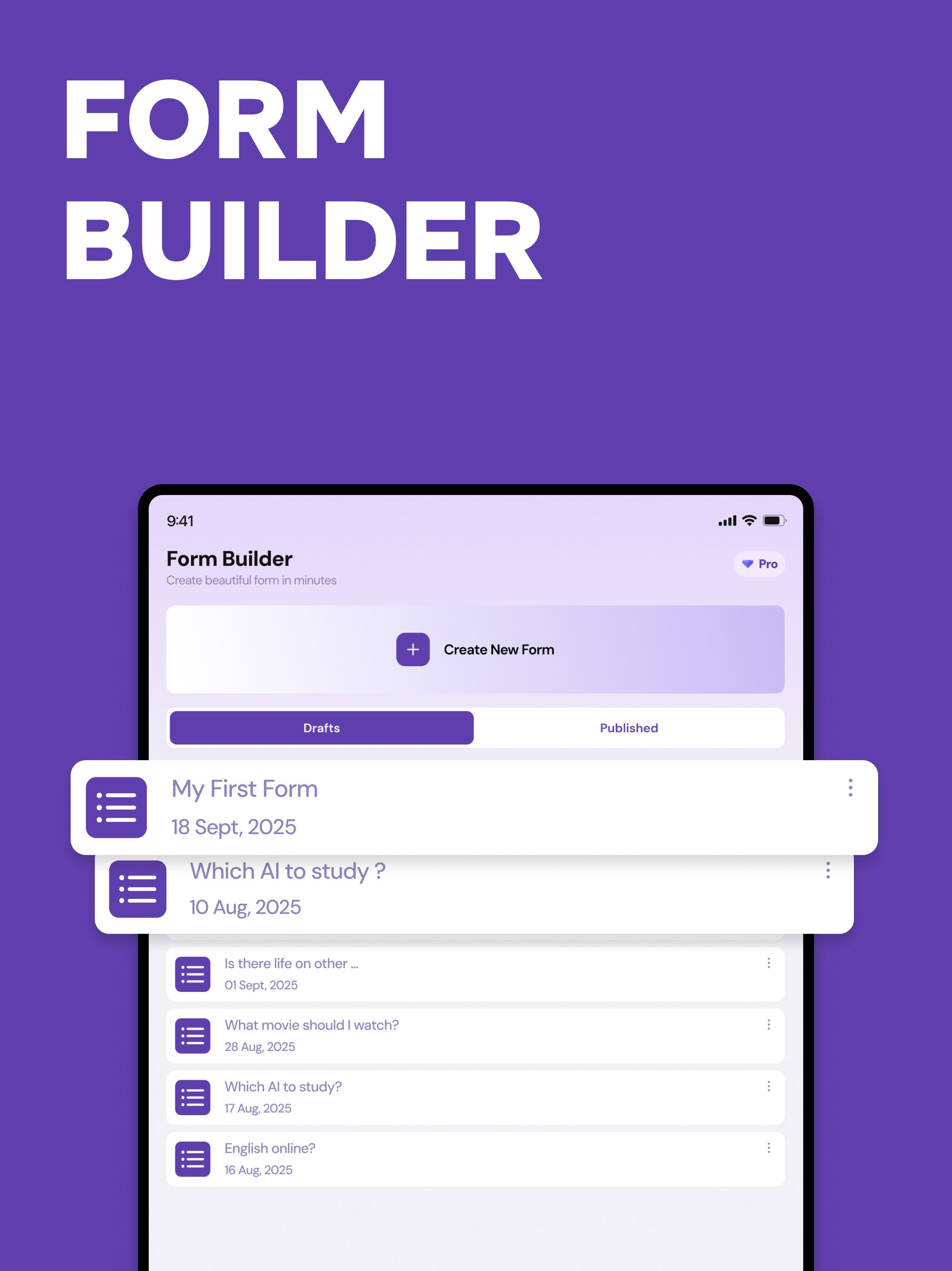 Easily create and manage your Forms anytime, anywhere. With Form Builder: Forms & Surveys, you can build forms in minutes, save them as drafts, publish when ready, and share without limits. Whether you’re collecting feedback, running a survey, or organizing an event, this app makes it simple and fast.