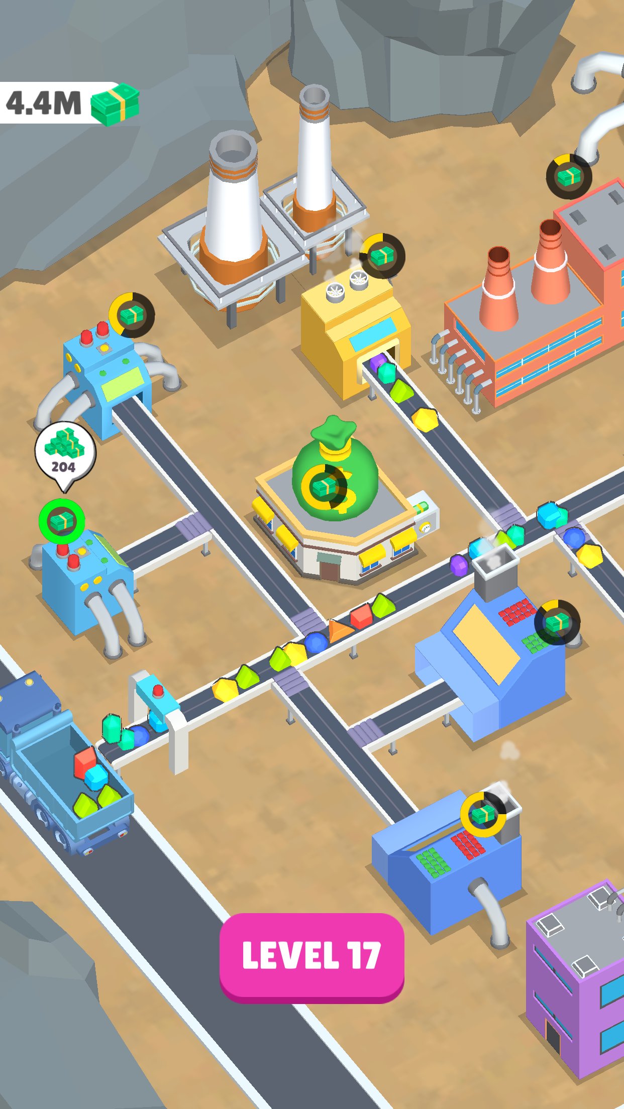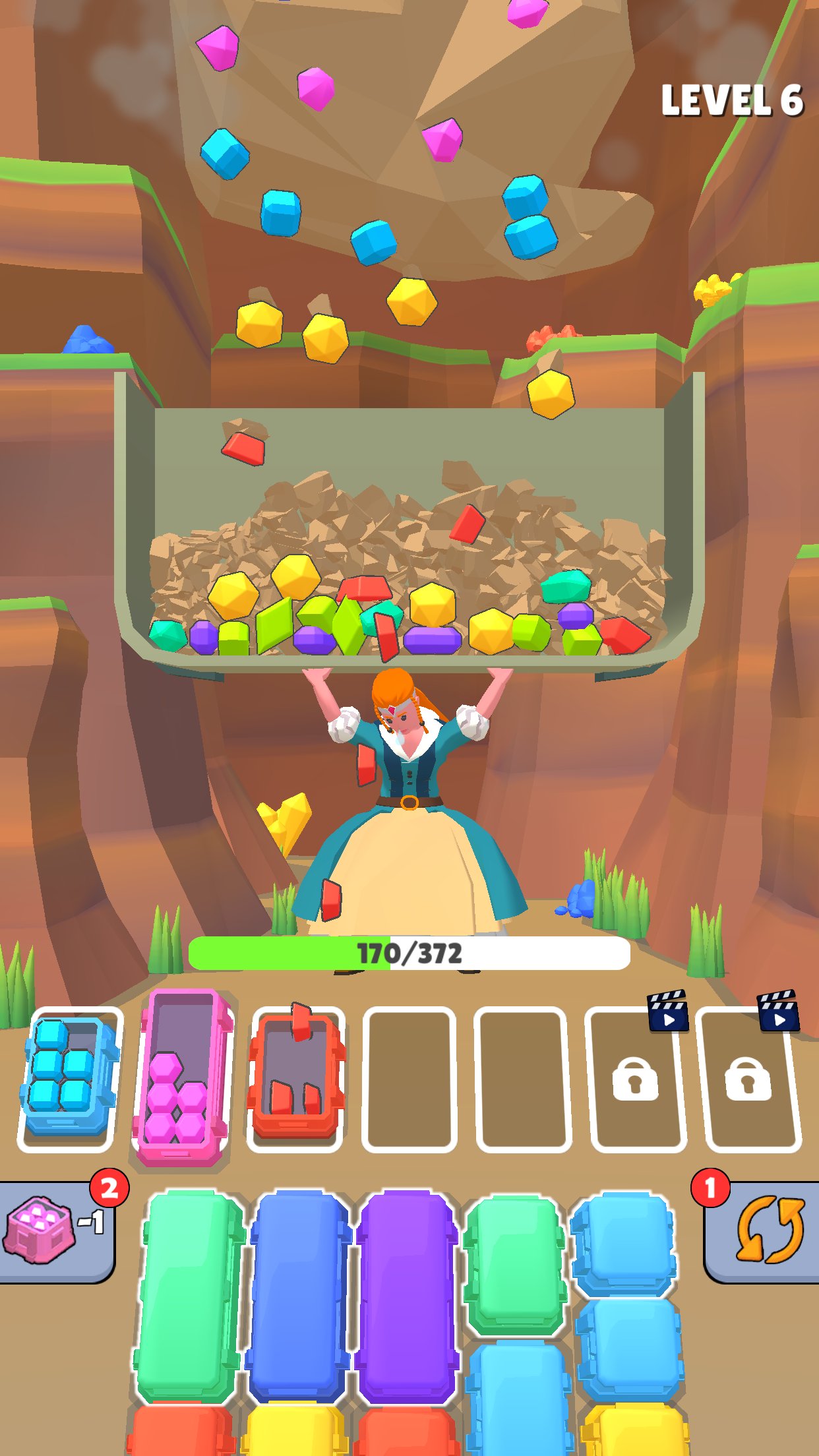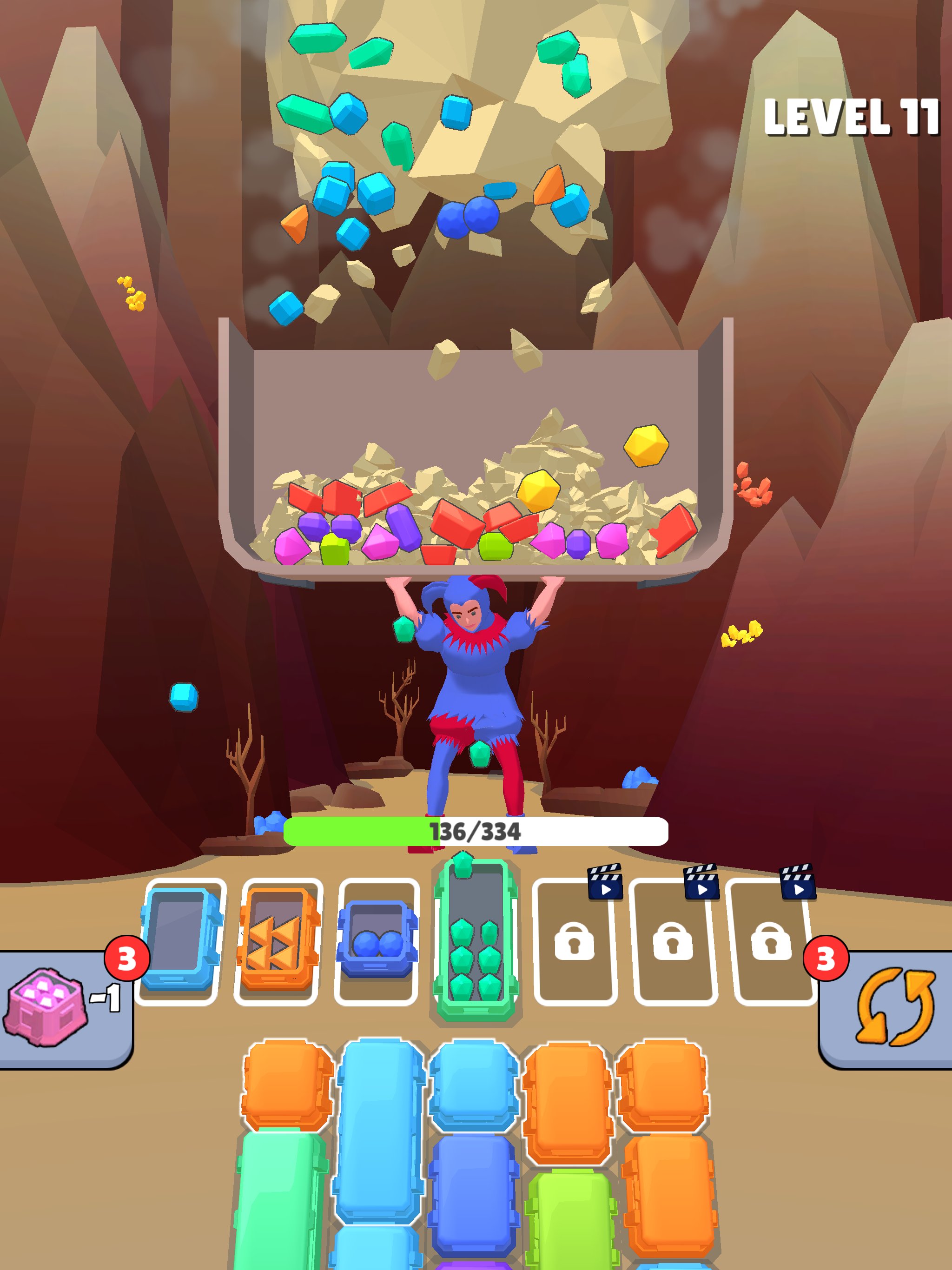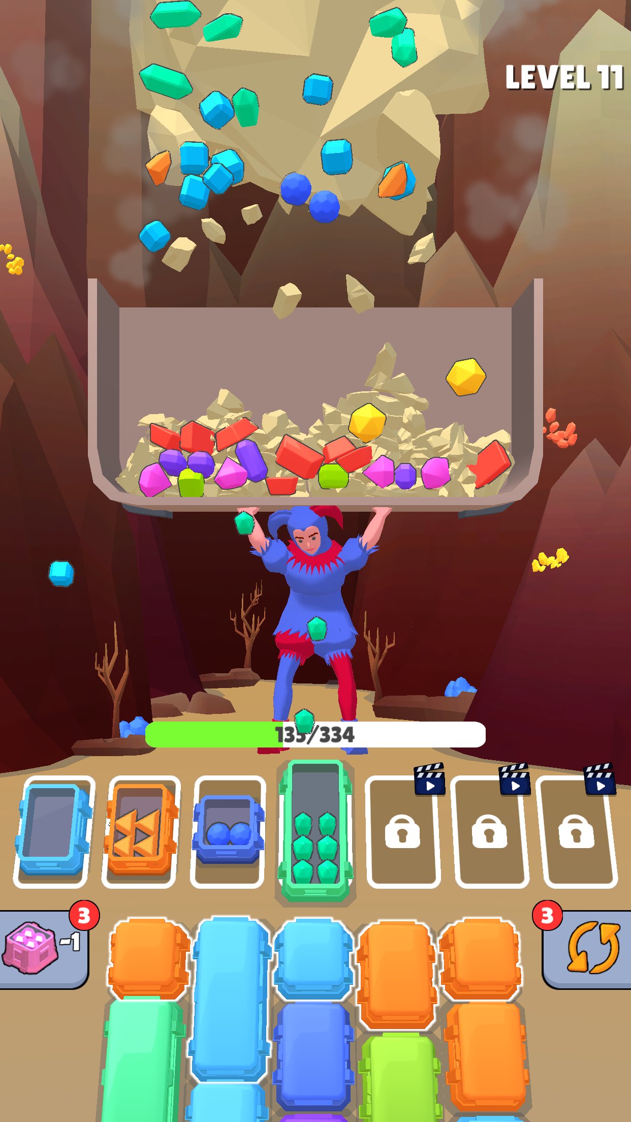 This is a very challenging puzzle game. In the dangerous mine, the king is struggling to hold up a full load of gems and waiting for rescue. You need to click on the box of the corresponding color according to the color of the gem to complete the collection. There are a total of 7 empty spaces for boxes. If the space is full, the game fails. The mine will continue to collapse and generate more gems. You can build a factory to process and sell these gems. With each breakthrough, the arrangement of gems becomes more complicated. You need to flexibly allocate large and small boxes according to the number and color of gems to overcome many difficulties, successfully rescue the king, and win the final victory!