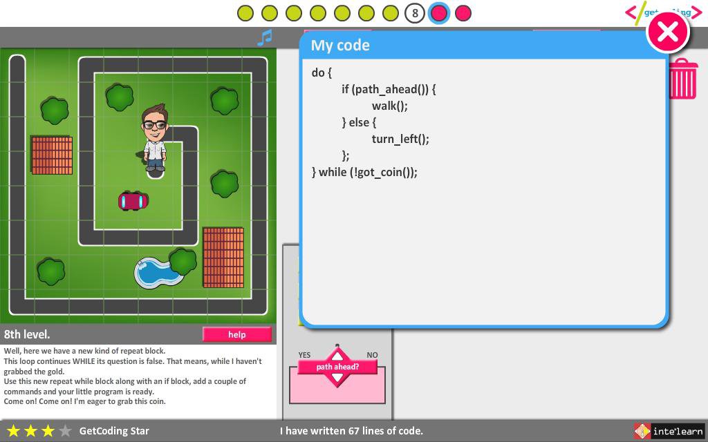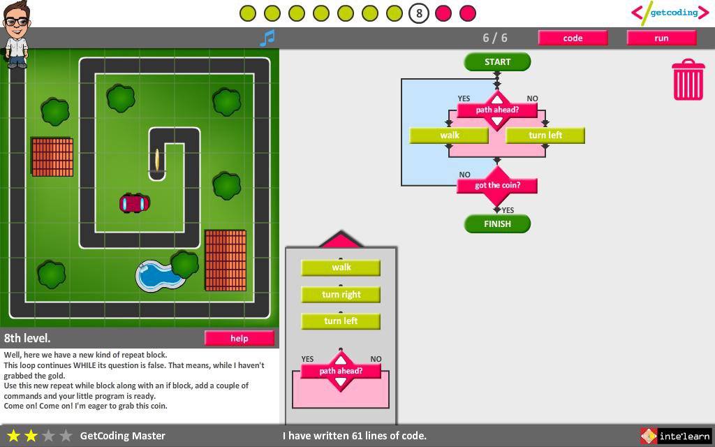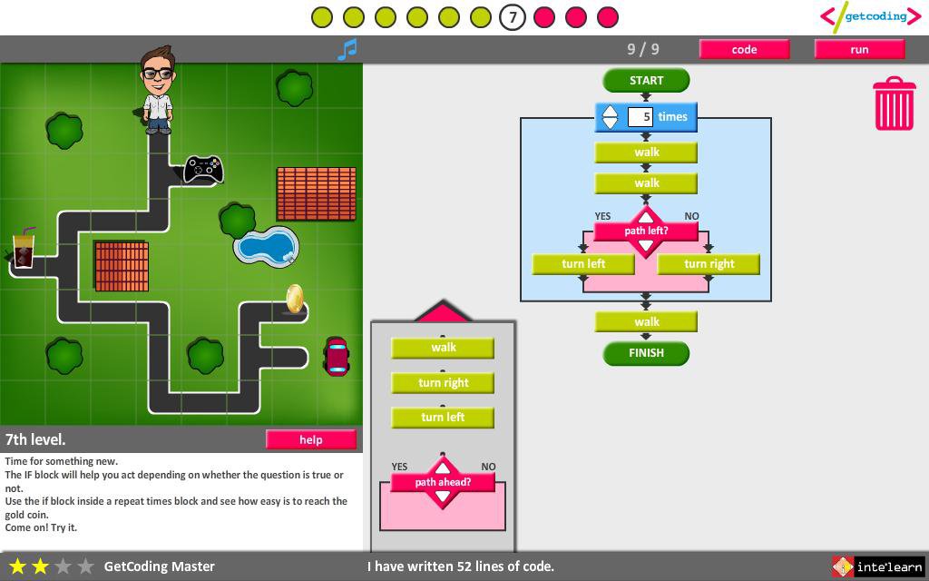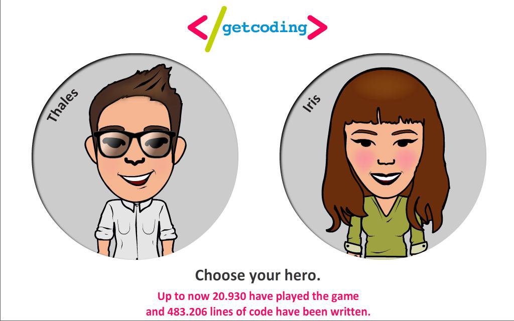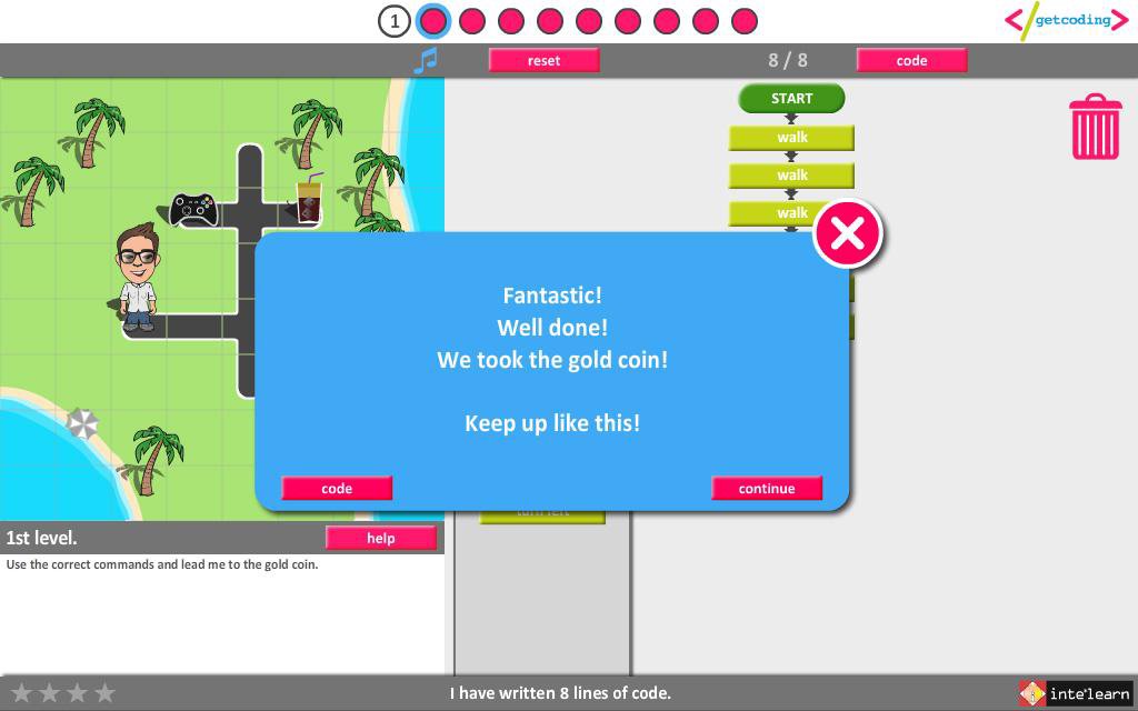 Children use a simplified visual programming language in order to help Thales and Iris find the gold coins.