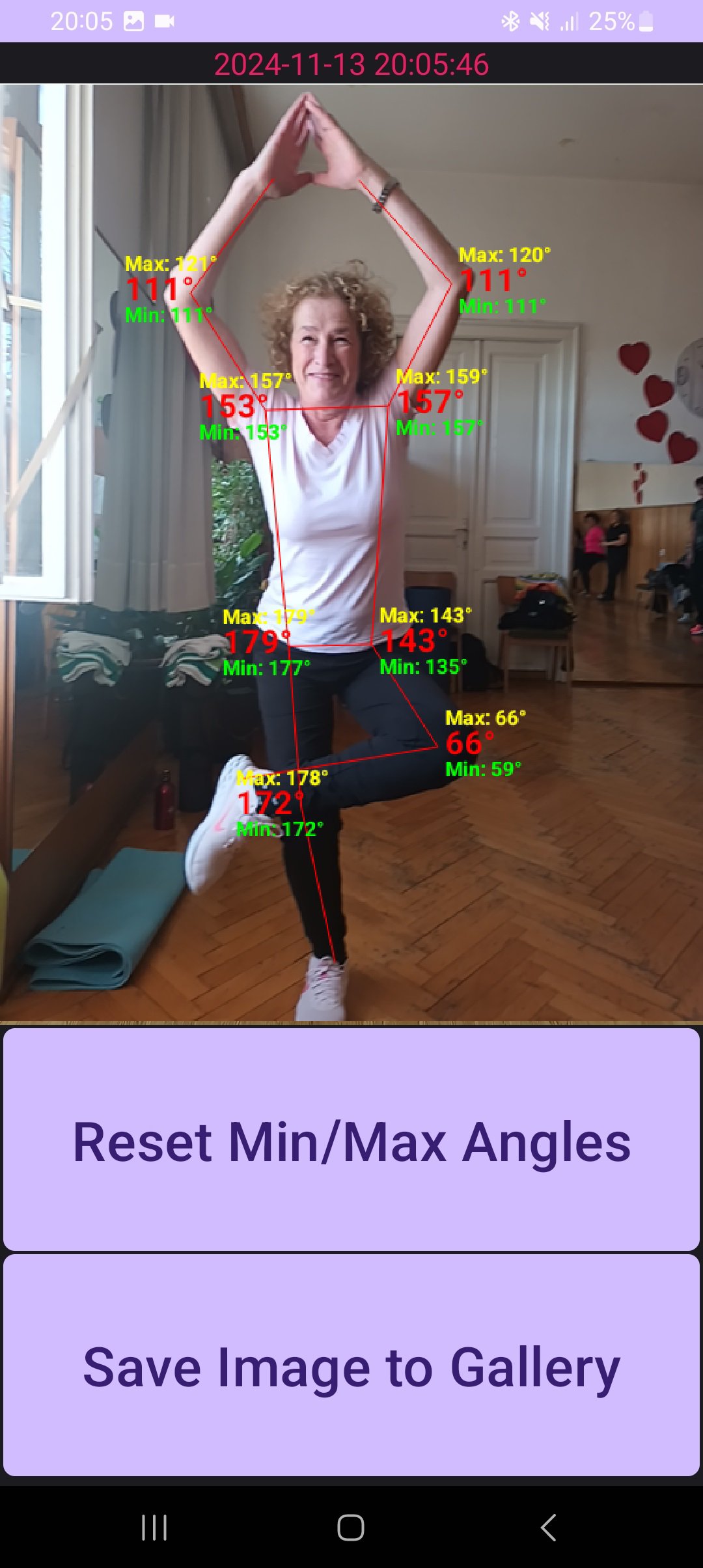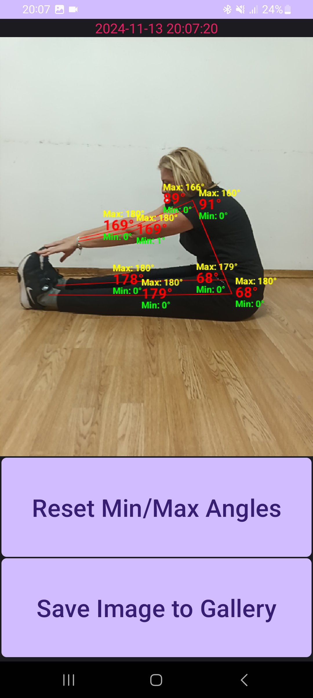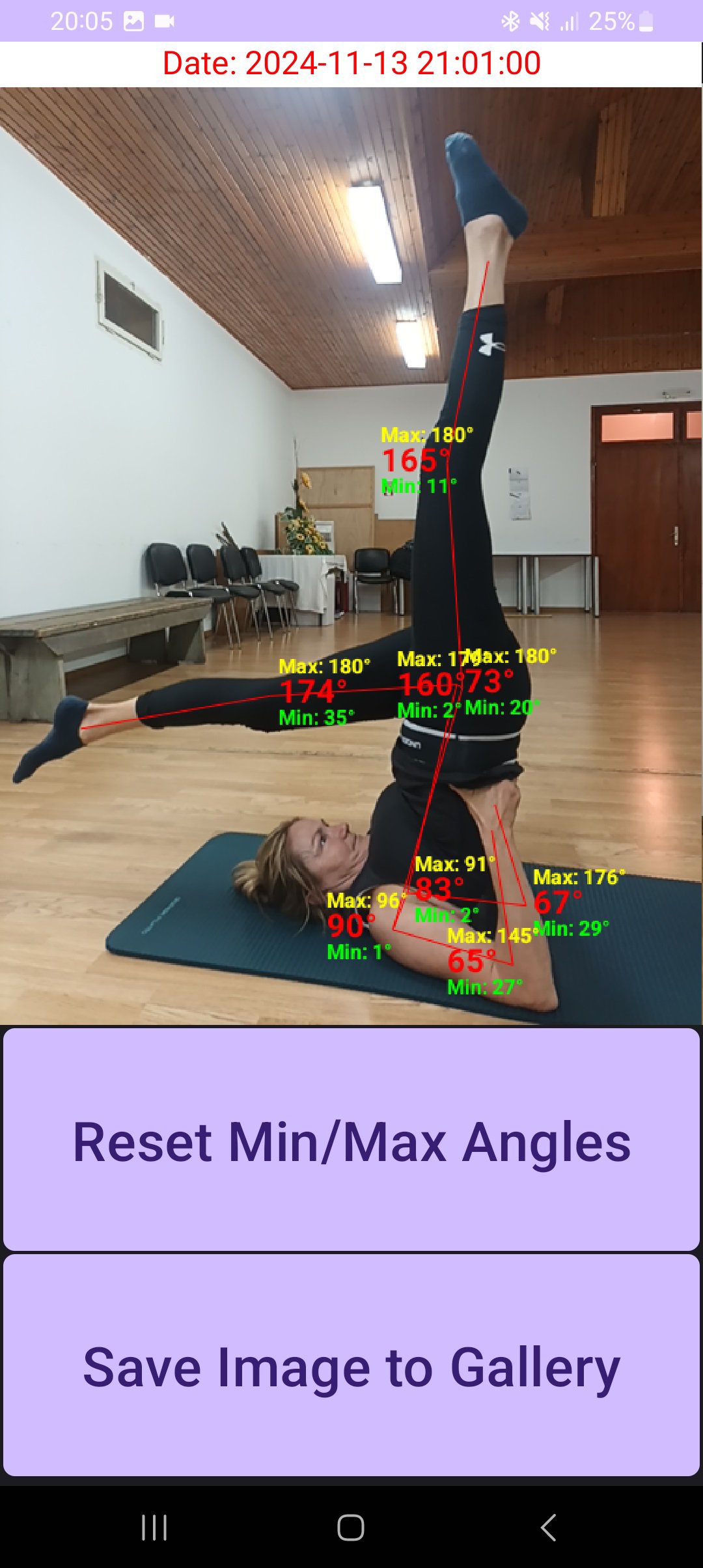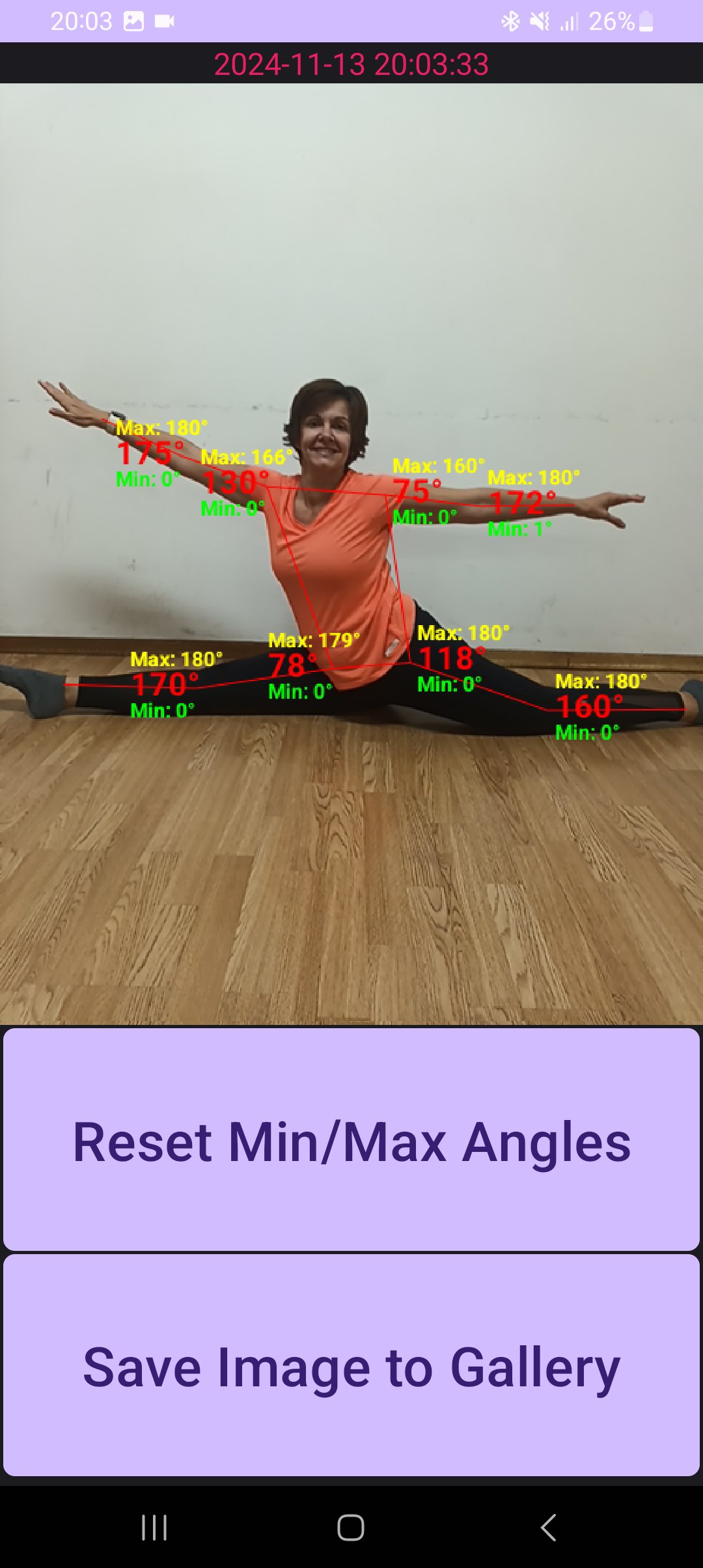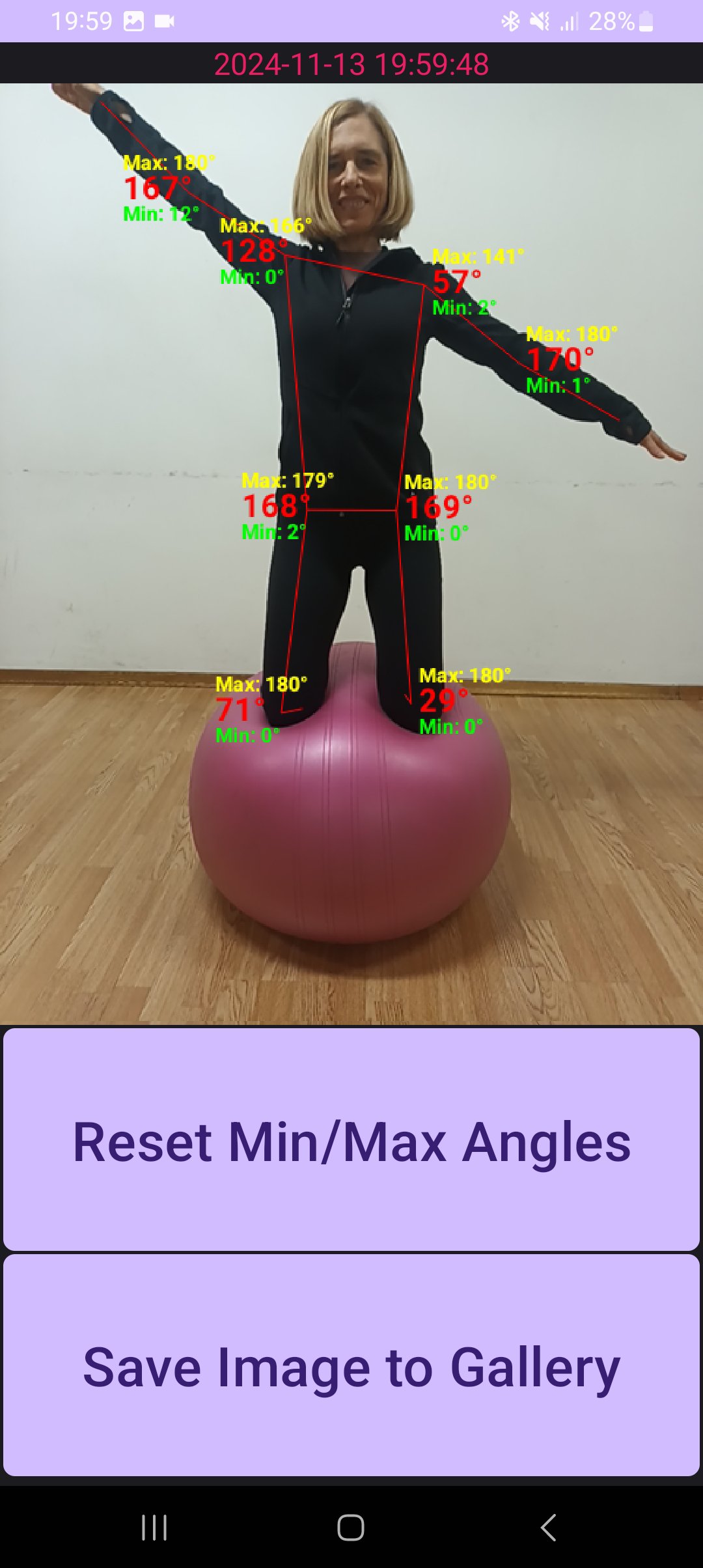 Goniometer is a powerful yet simple Android app for measuring joint angles with AI. It automatically detects key joints, including elbows, shoulders, hips, and knees, displaying precise angles next to each joint. For optimal accuracy, simply point your phone’s camera perpendicular to the plane of the joint’s movement and snap a picture. The image is saved directly to your phone's gallery, making it easy to track progress and share measurements. Ideal for physiotherapists, athletes, and anyone interested in mobility analysis.