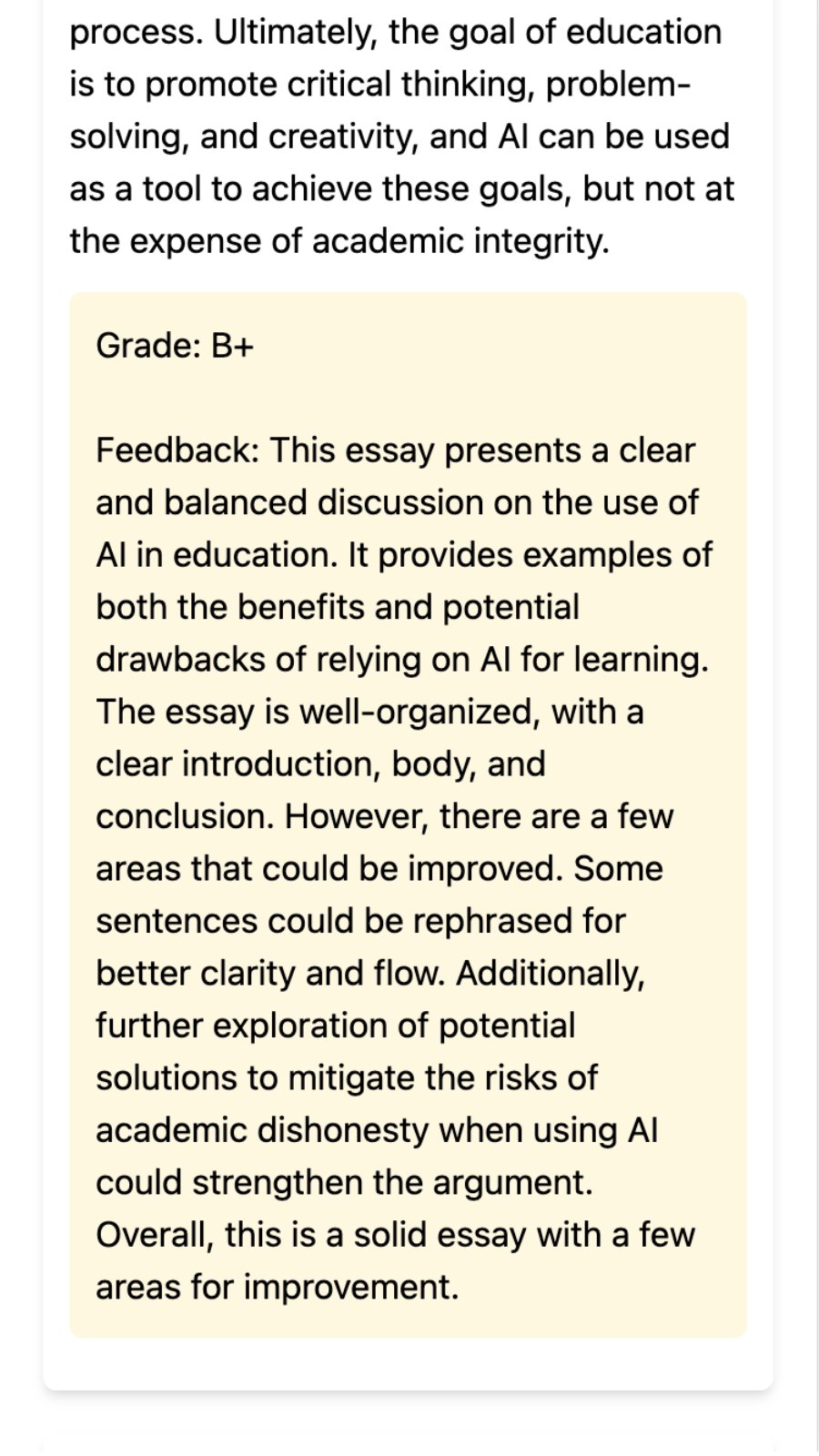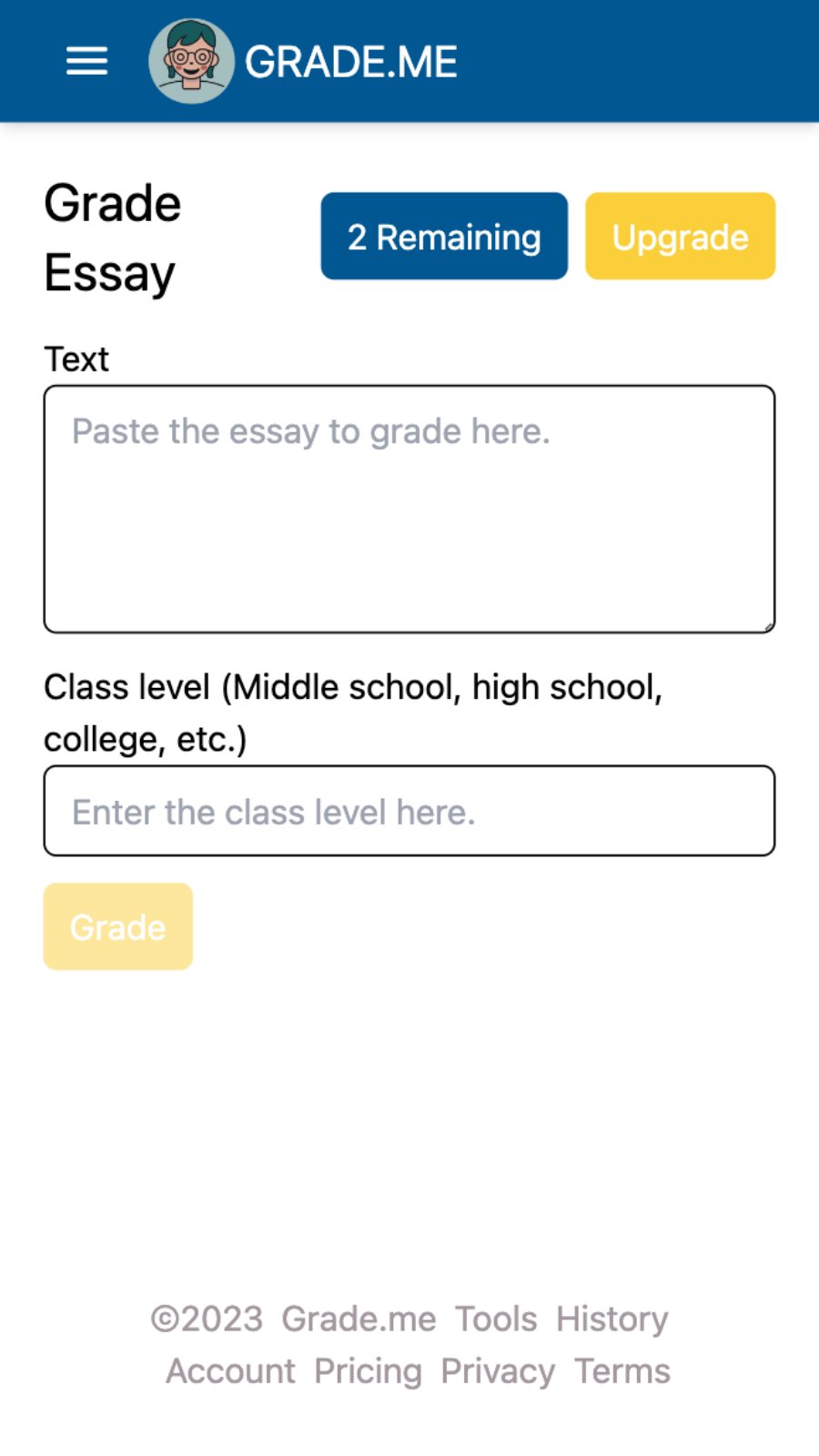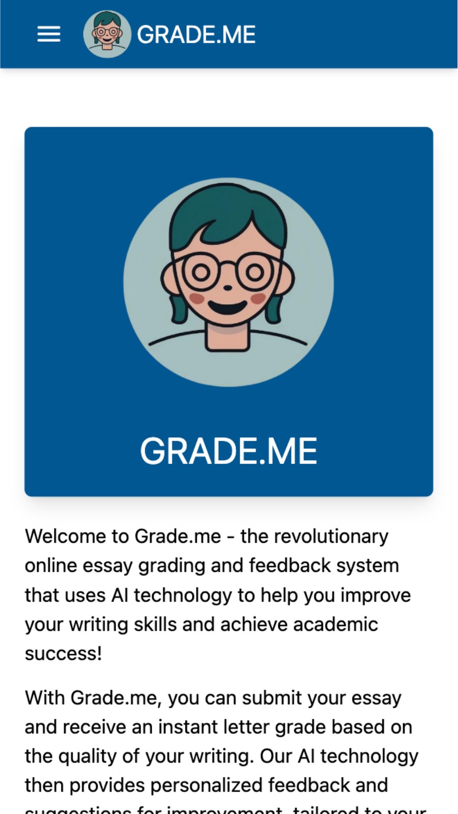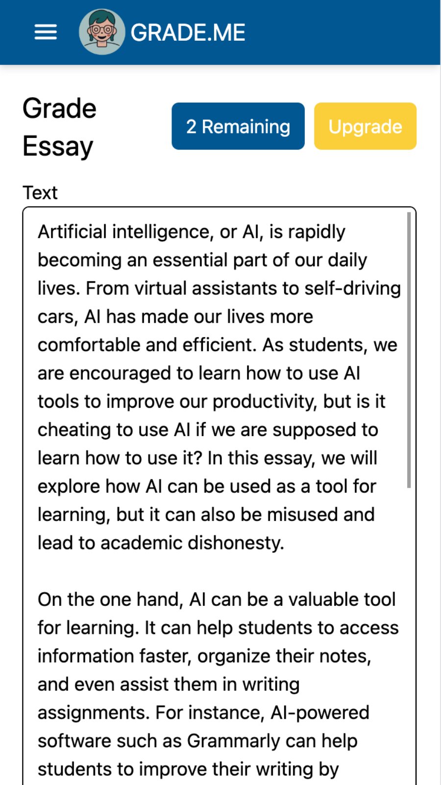 Welcome to Grade.me - the revolutionary online essay grading and feedback system that uses AI technology to help you improve your writing skills and achieve academic success! With Grade.me, you can submit your essay and receive an instant letter grade based on the quality of your writing. Our AI technology then provides personalized feedback and suggestions for improvement, tailored to your specific education level and writing style.