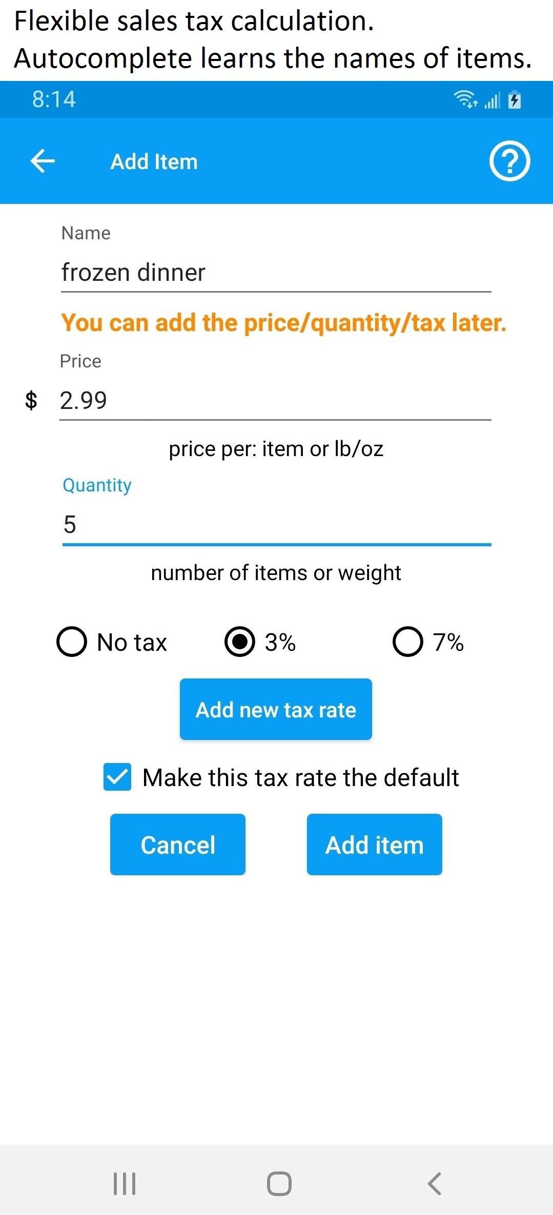 Designed for people with a tight shopping budget. Combines a calculator with a shopping list. Make a grocery list by adding items without prices, then add prices at the store. Items and their prices can also be added while you shop.