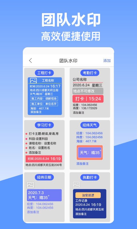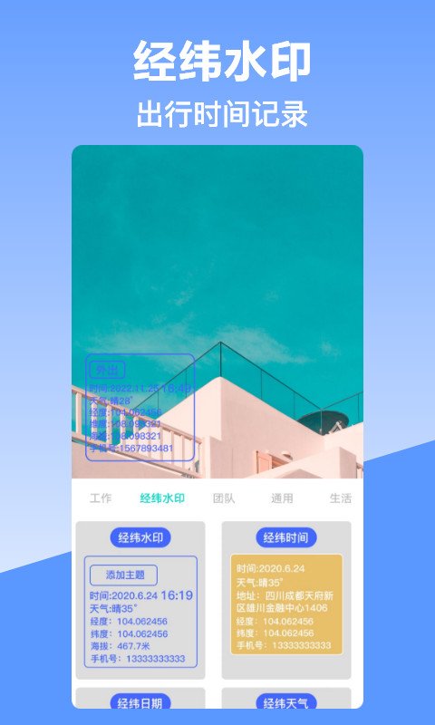 模板丰富,包含工作水印、经纬水印、生活旅游水印、日常通用水印,提供考勤打卡、工程打卡、执勤打卡、学习打卡、经纬水印打卡、经纬时间打卡、经纬日期打卡、经纬天气打卡、提供日期、日历、农历、旅游定位等水印。