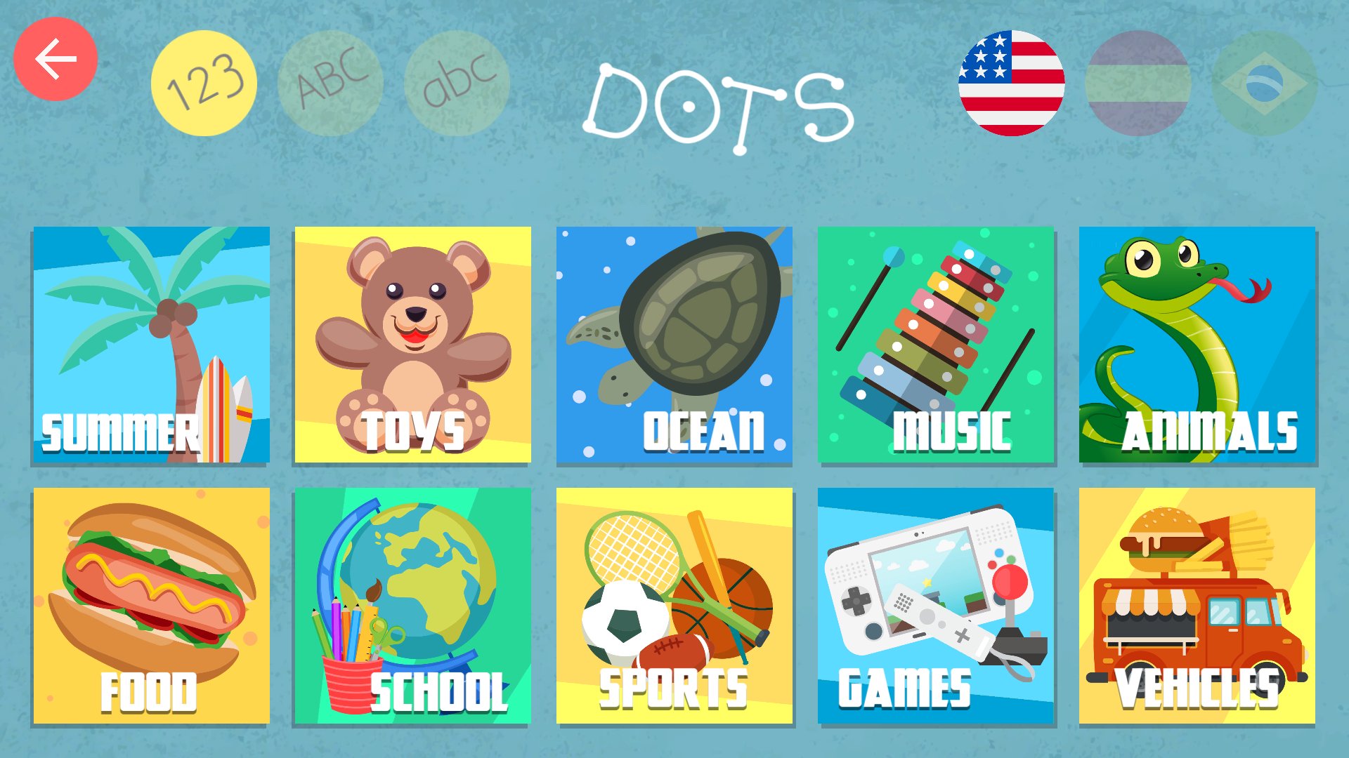 Connecting the points children will learn the alphabet and numbers in three languages, English, Spanish and Portuguese. In addition they will improve their motor skills and learn to recognize the silhouette of objects.