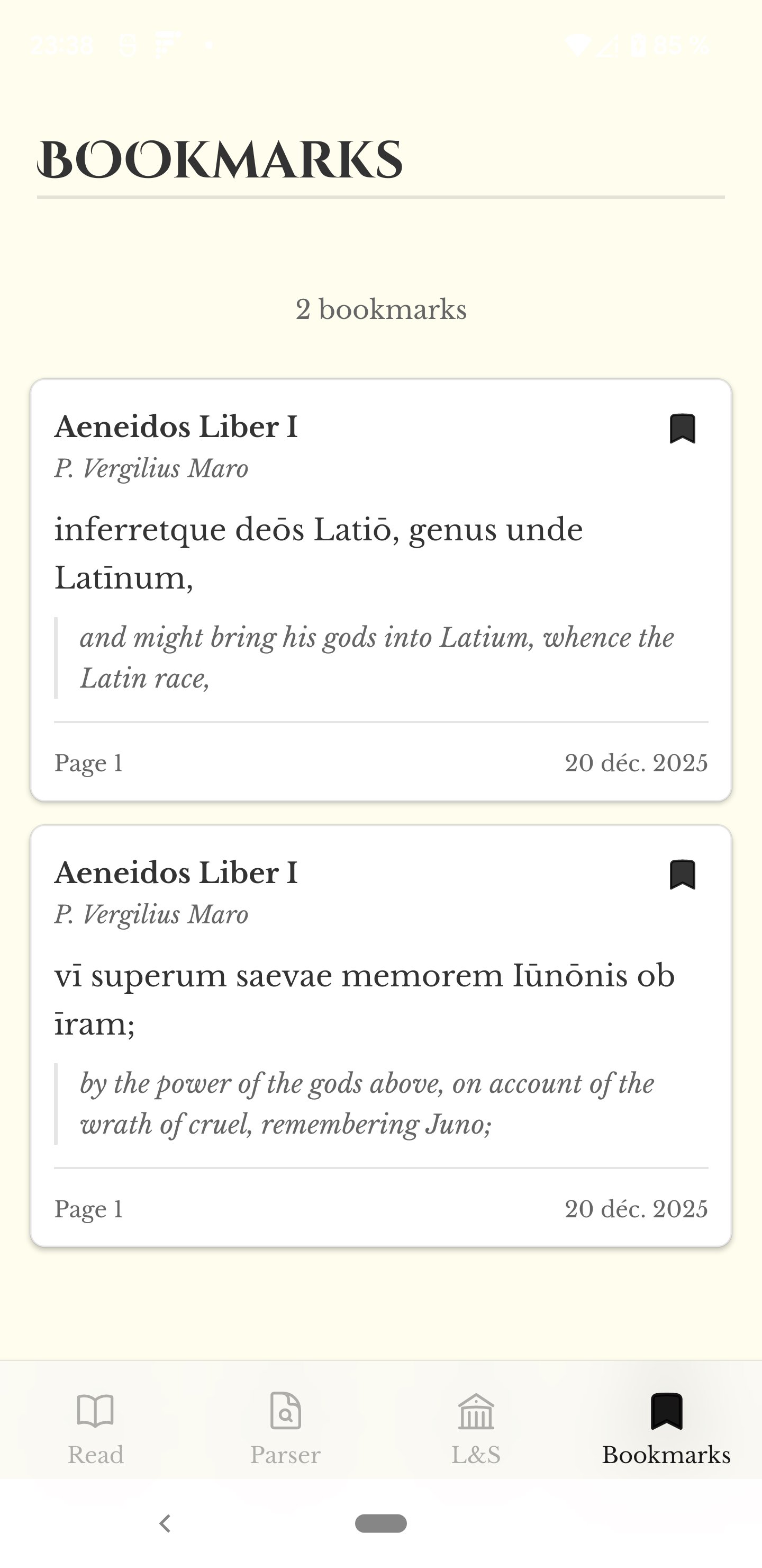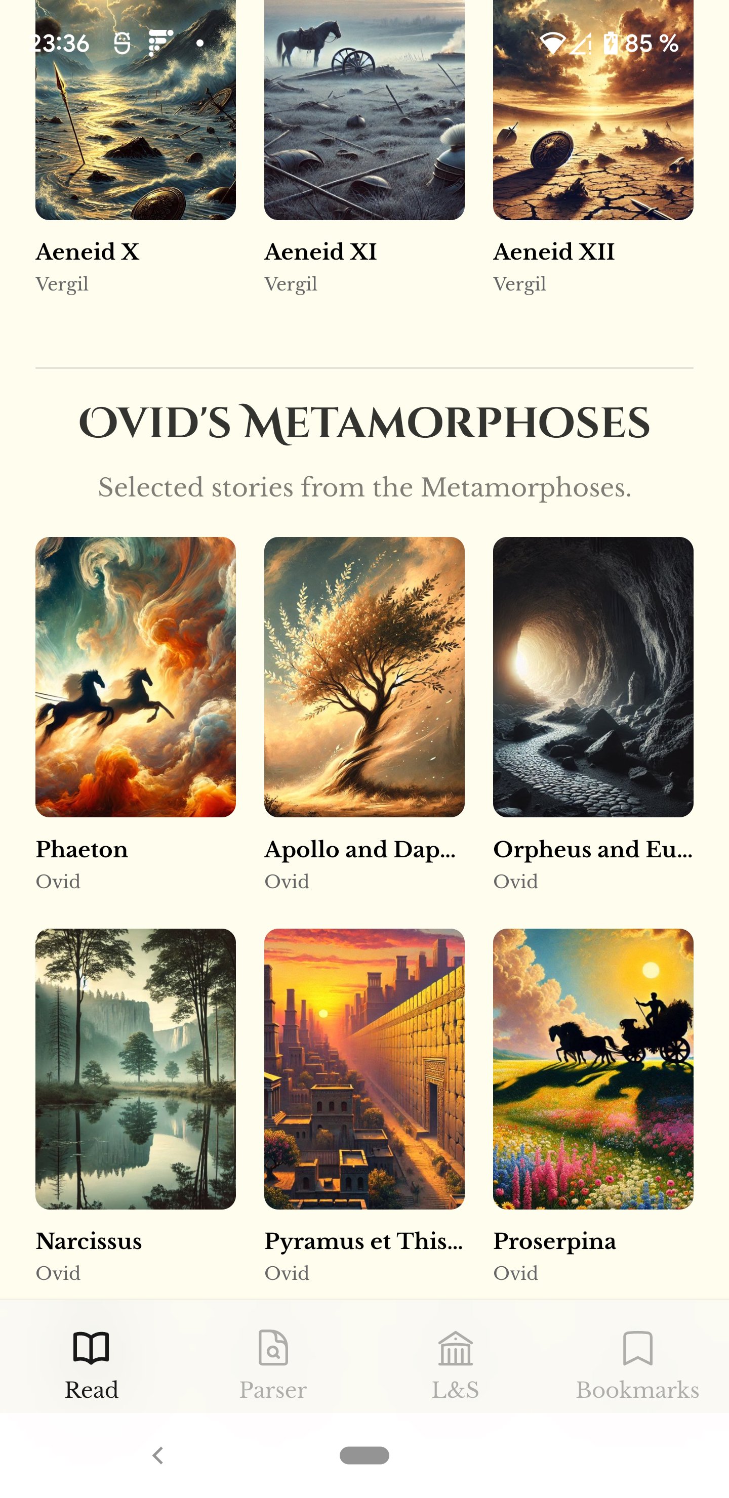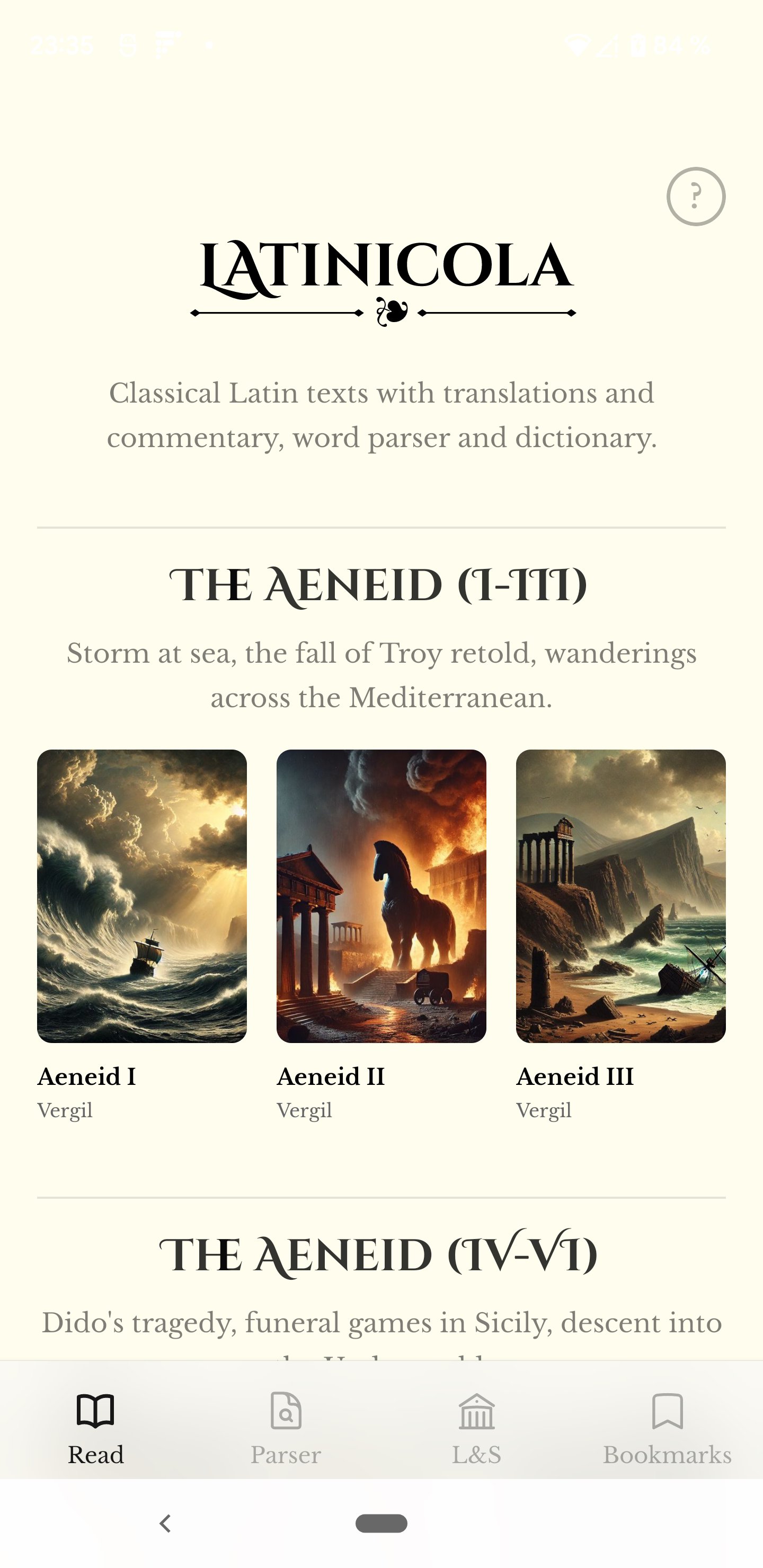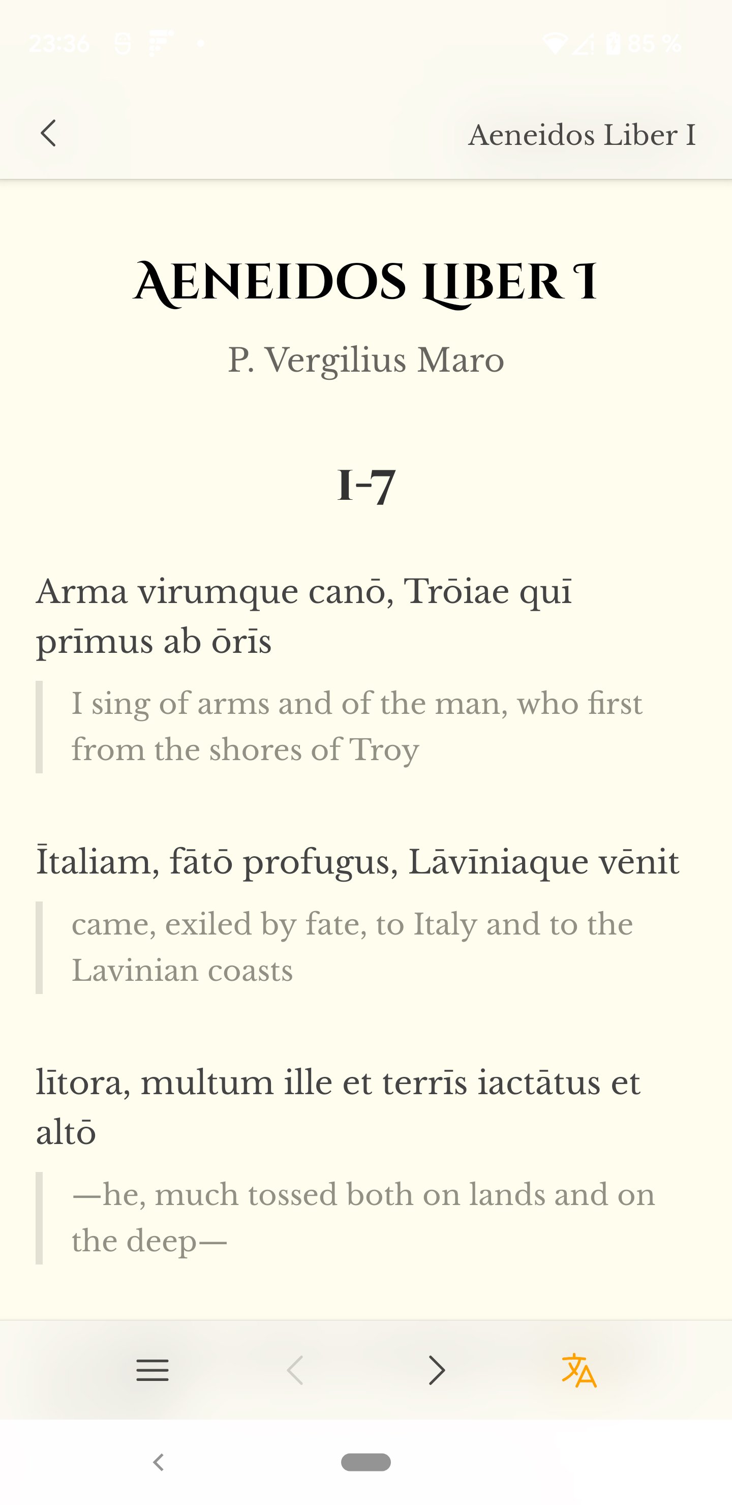 Dive into Classical Latin works like Vergil's Aeneid and Ovid's Metamorphoses, alongside verse-by-verse interlinear translations and concise commentary. Latinicola is designed to support careful reading: each translation is based on public-domain human translations, then adapted to align precisely with individual lines and passages. Whether you are a student, a teacher, or a reader returning to Latin for pleasure, this app helps you move confidently between Latin and meaning without losing the rhythm, structure, or nuance of the original text. The integrated parser and dictionary tools help you focus on your study without requiring different apps.