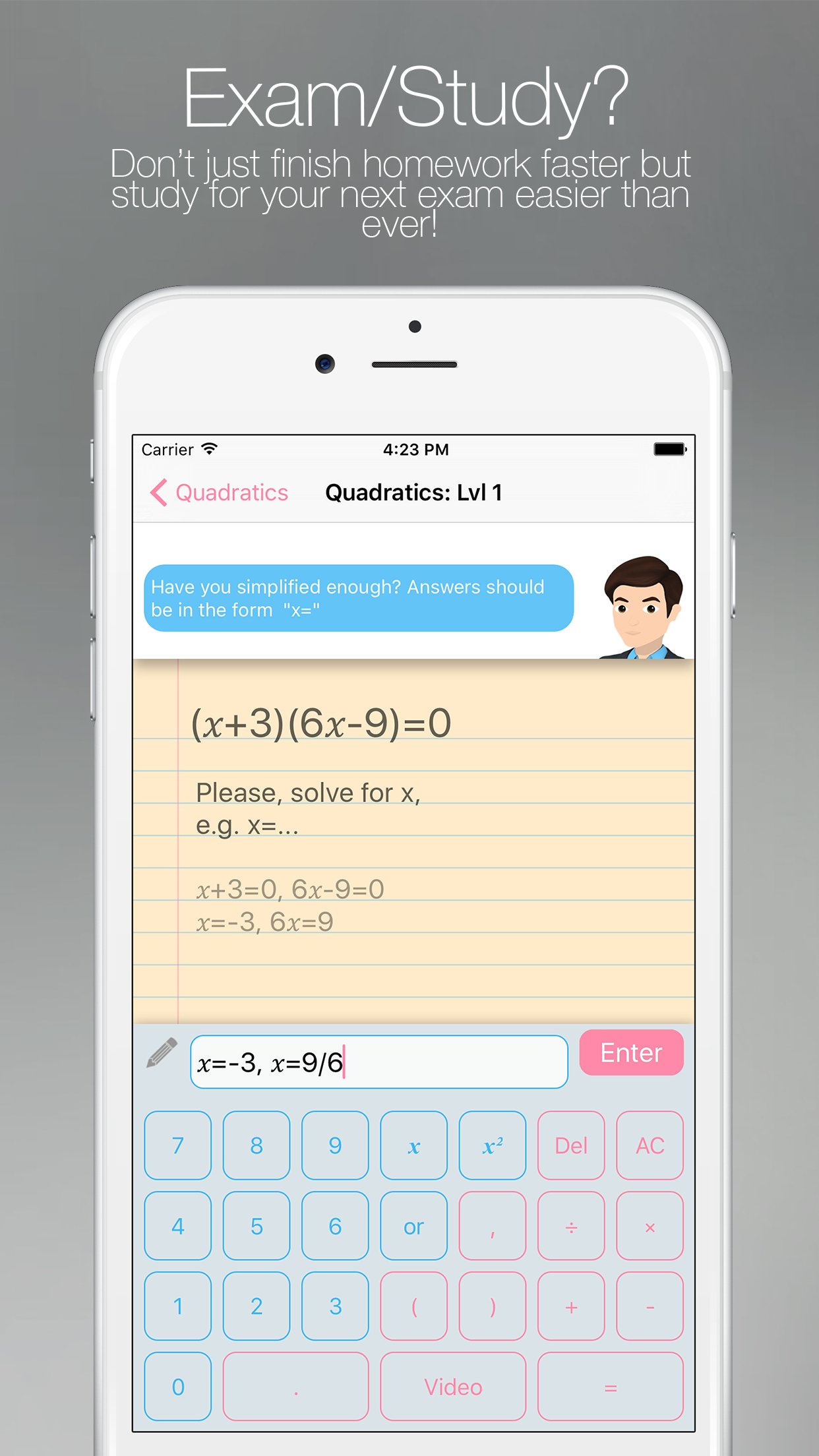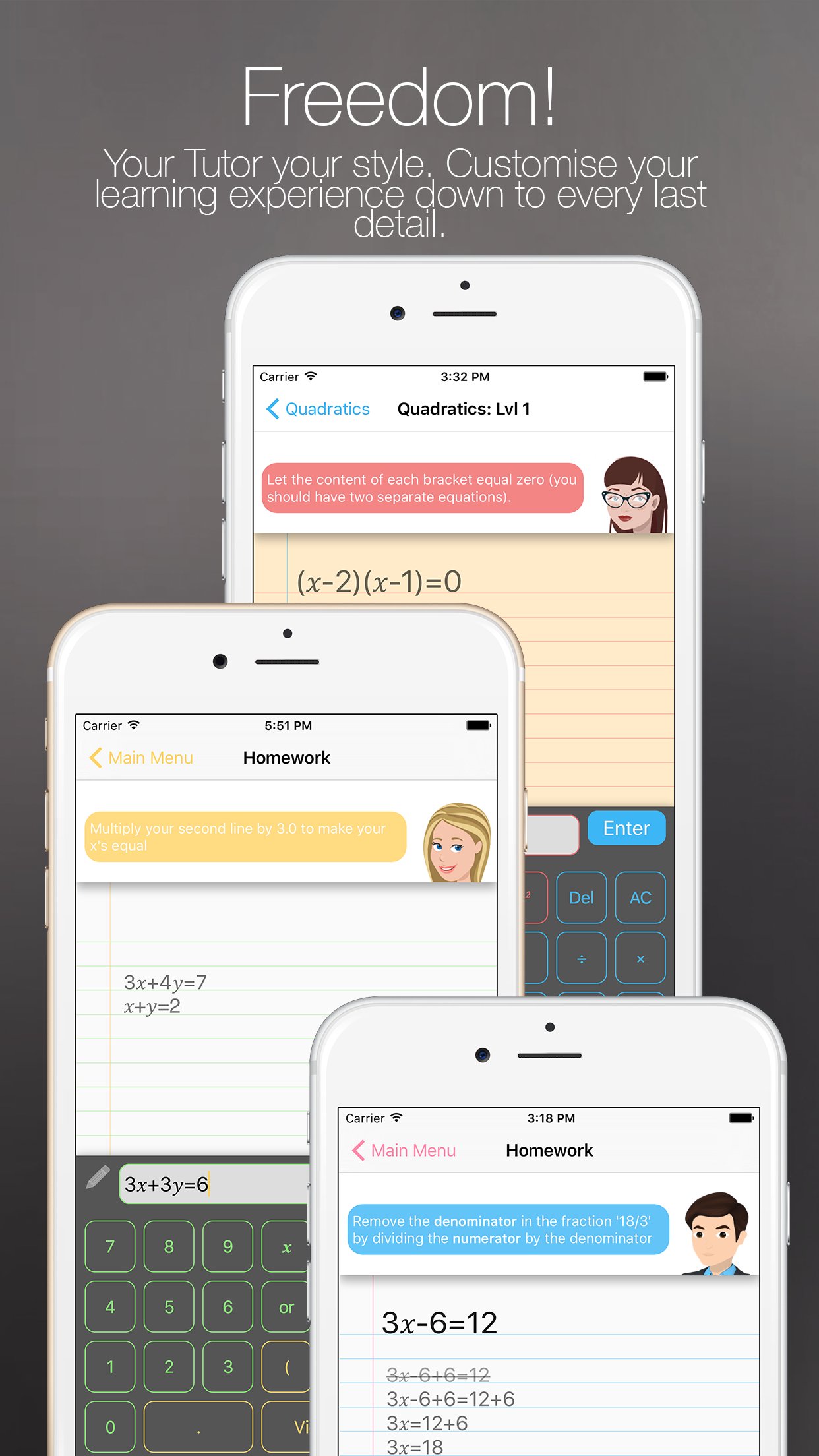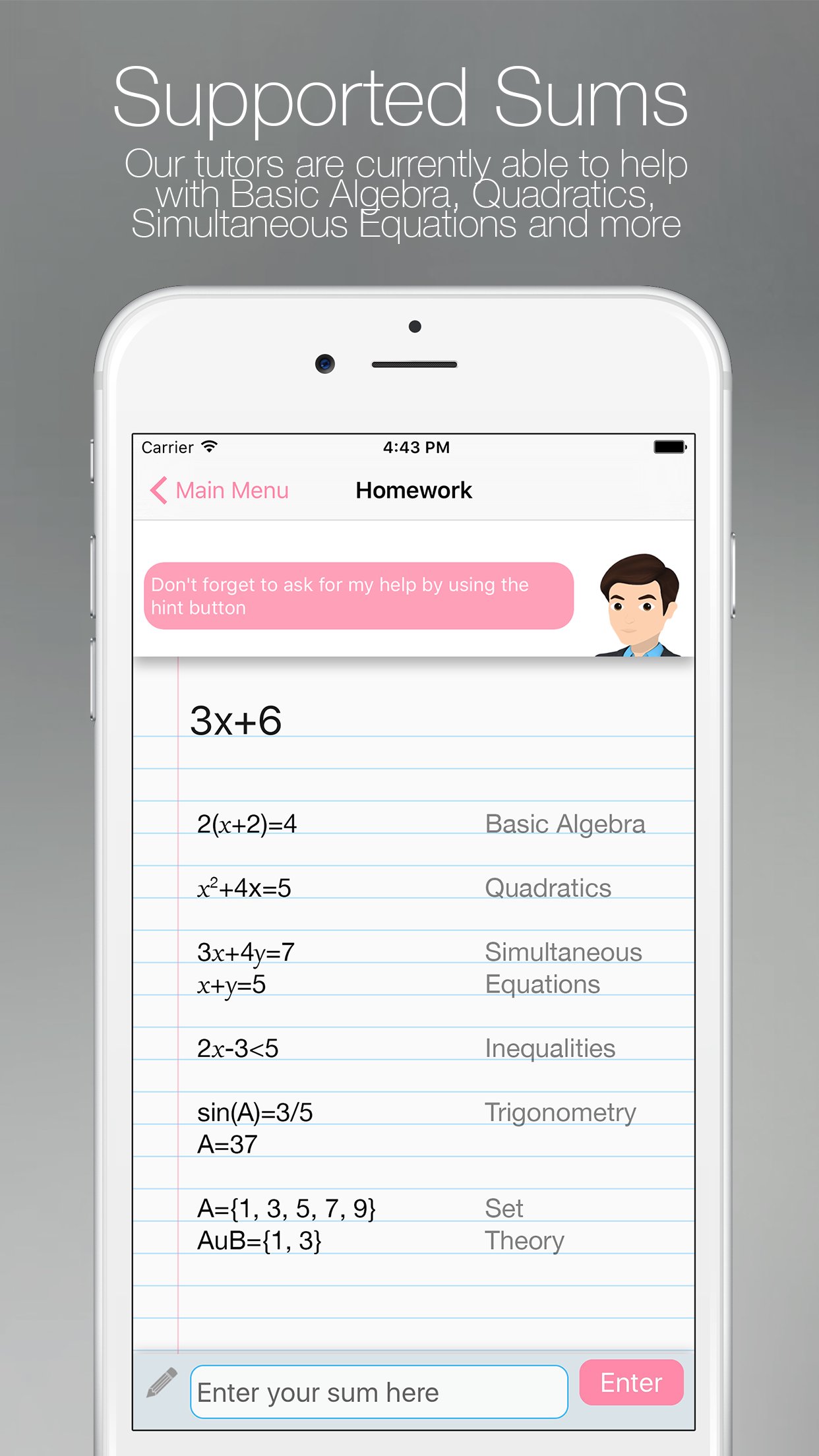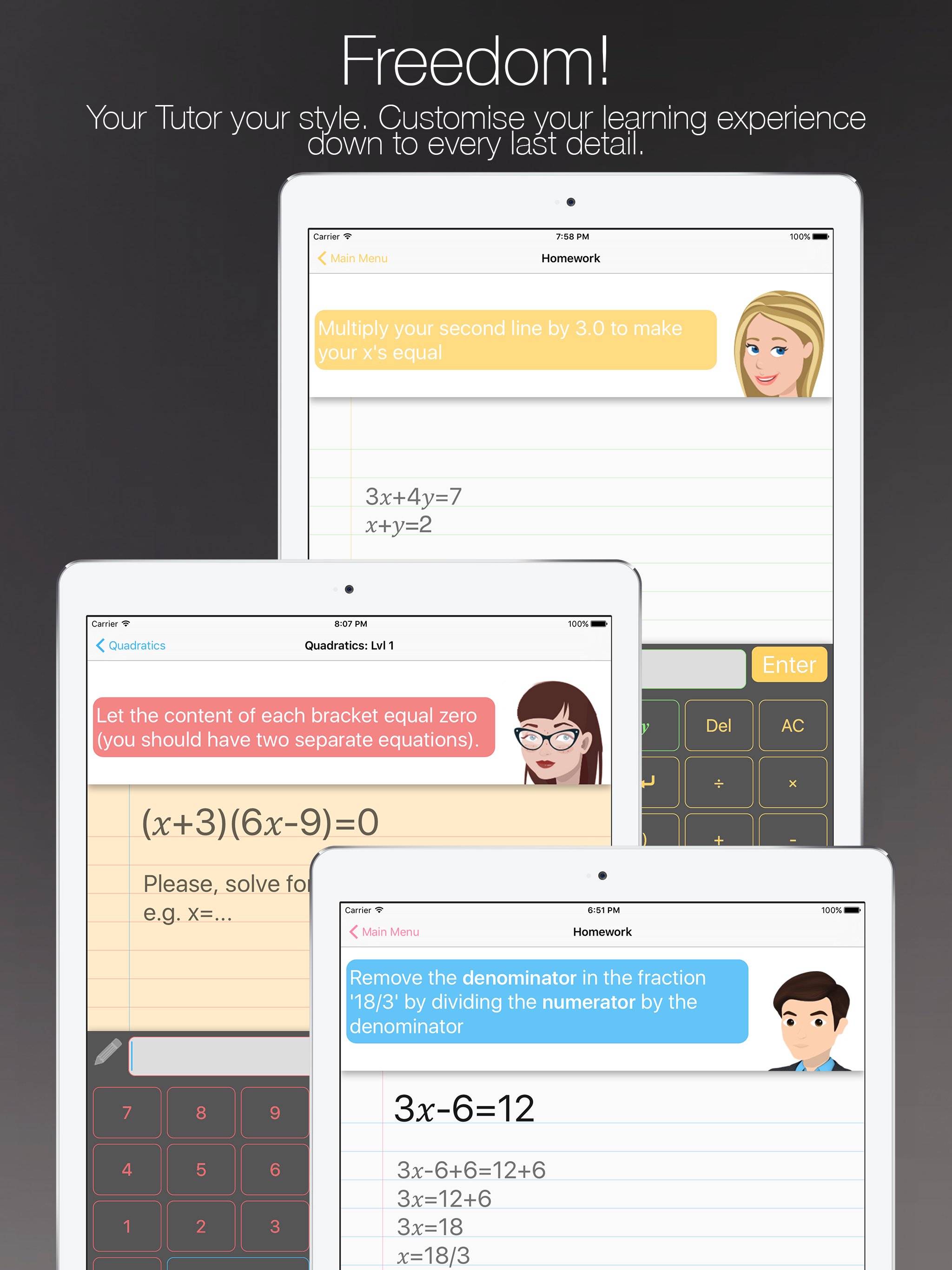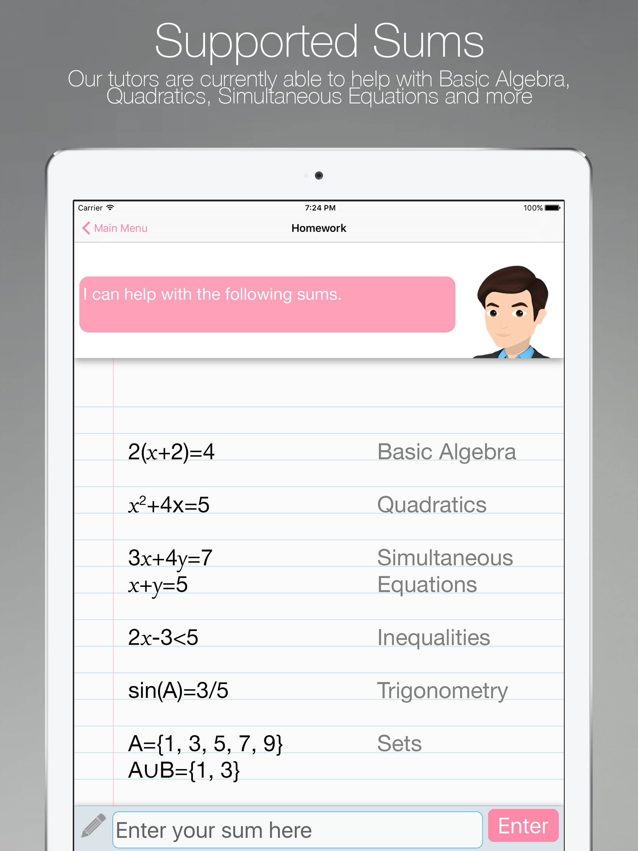 Pick your Math tutor who will work with you line by line on your homework spotting errors and giving you hints, tips and even youtube videos to make sure you're never stuck on a question.