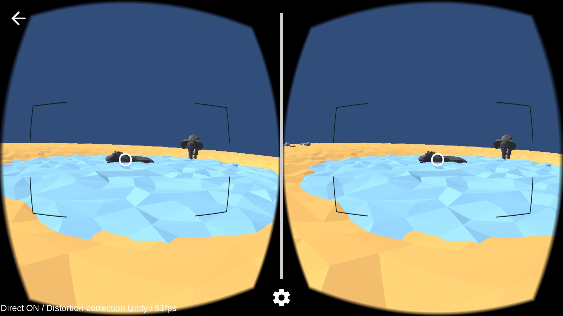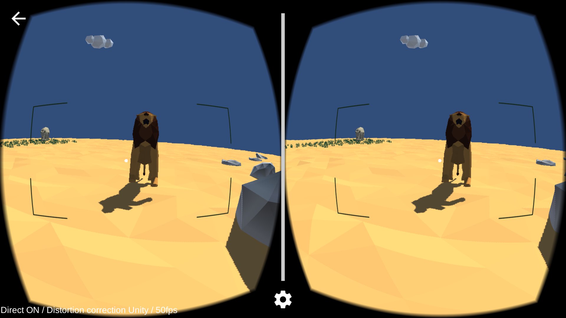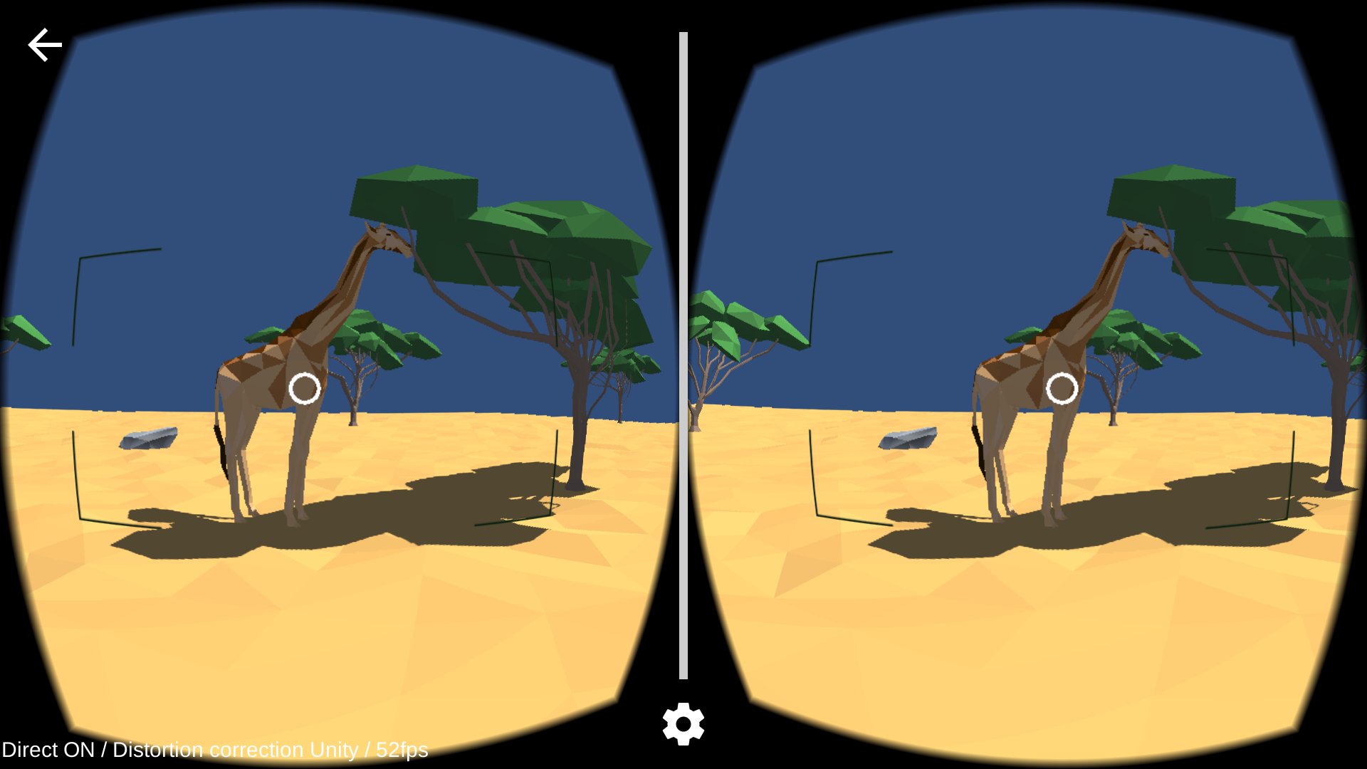 The user is dropped into the Savannah and has 10 film for his/her camera. To walk around, the user has to look down ~30 Degrees. To stop walking, they just have to look back up. With their camera, if they look at an animal, the circular indicator grows in size signalling that they can take a picture. To take a picture, the use presses on the Cardboard button.Points are assigned based off which animal the picture is of, and how far away the user is from that animal. There is a menu above the user that allows them to see how many Points they have and how many Tranq Darts and Photos they have remaining. There is also a button that when pressed (by looking at it and pressing the Cardboard button) will switch the user from using a camera to the tranq gun, and visa versa.