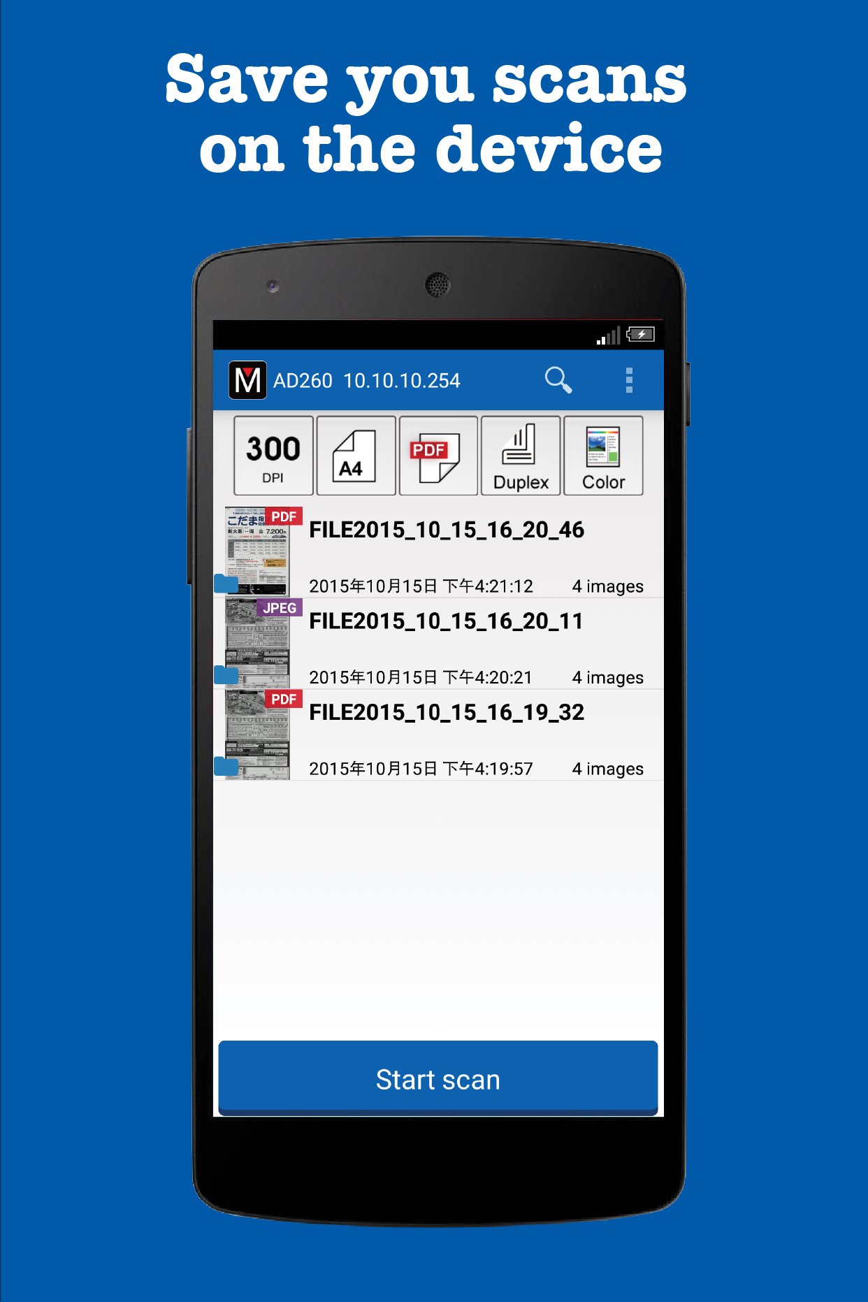 With this App you will able to control scanner to scan directly from app and save images in mobile device.