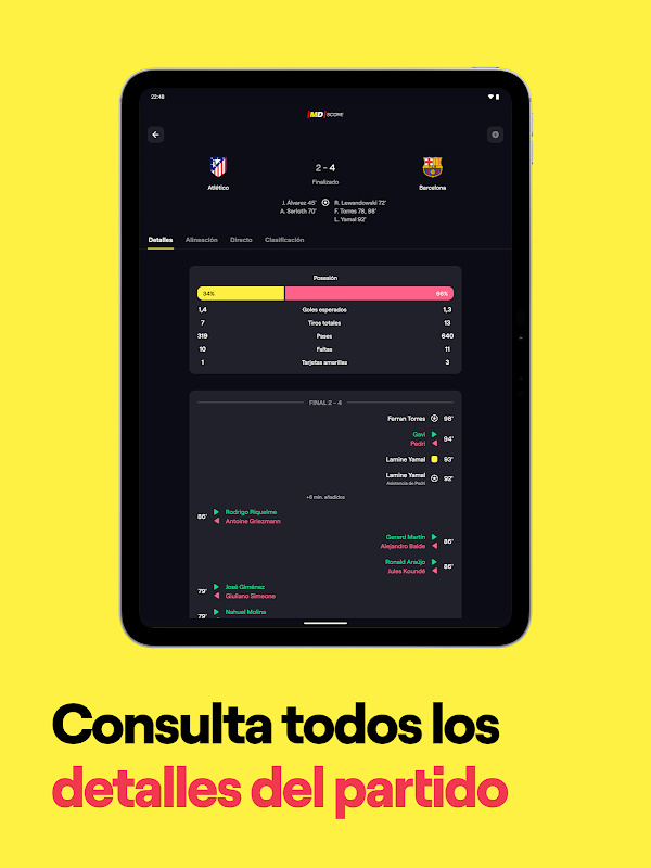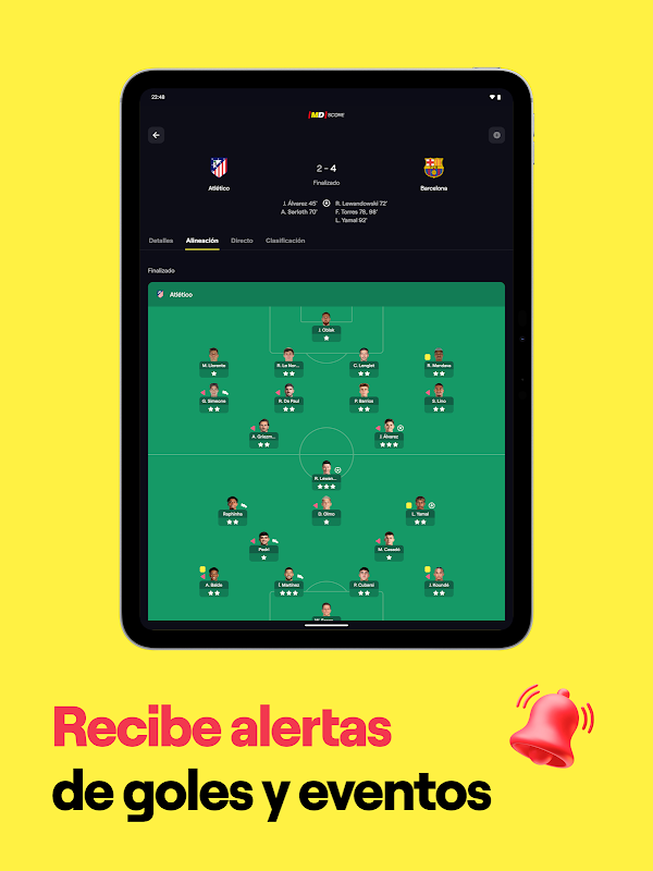 Unlike the other official app, focused on news, MD Score focuses on offering results and events, complementing your sports experience without replacing anything. Take football with you and don't miss a single goal.