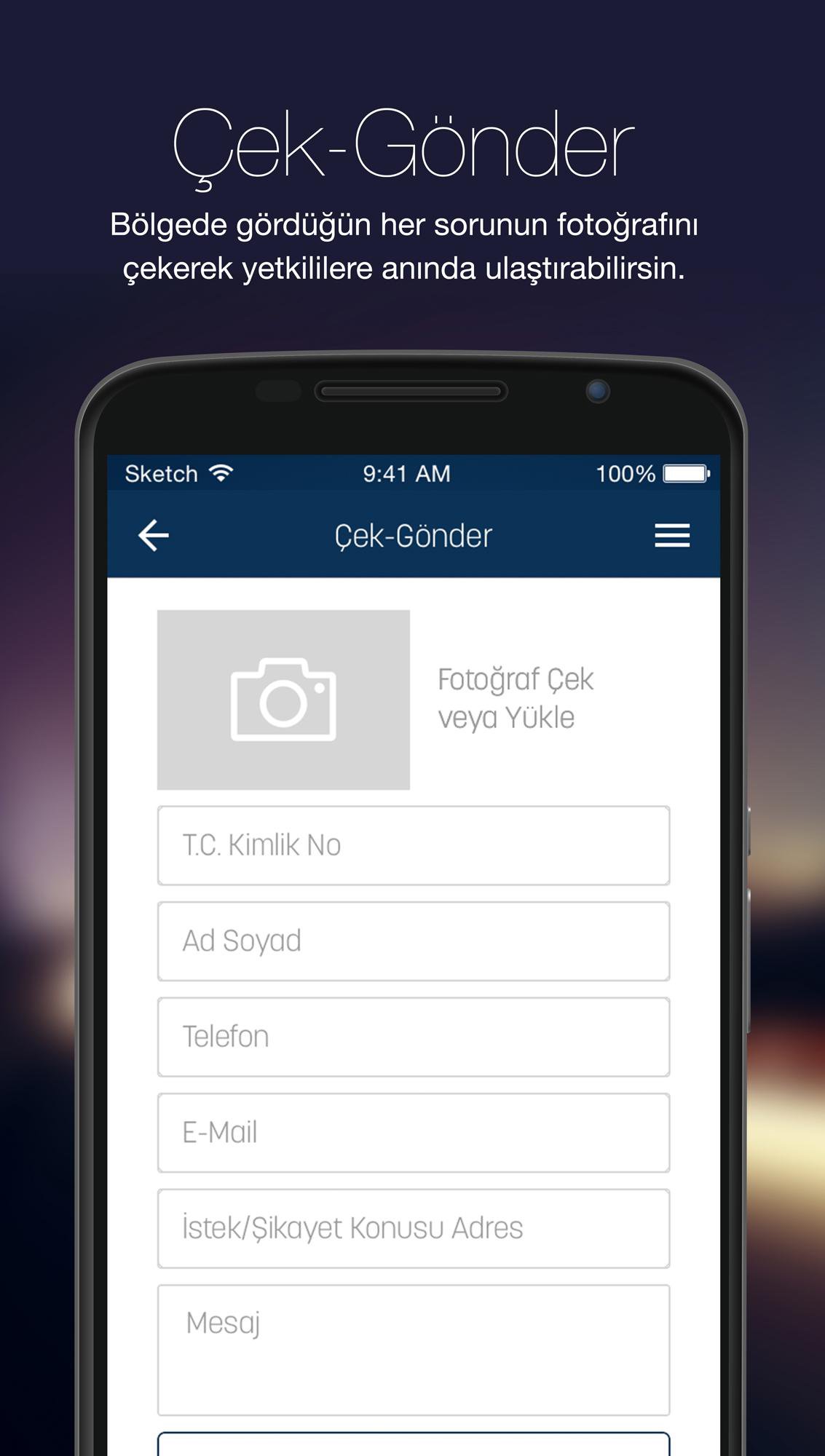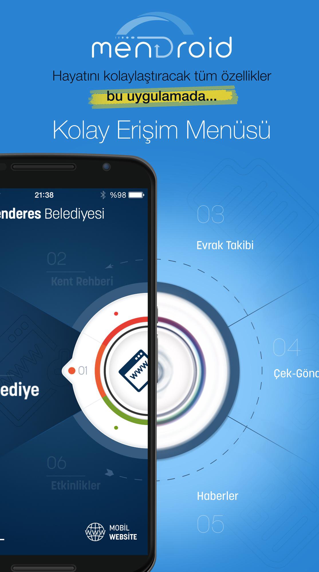 * Çek-Gönder özelliğiyle Menderes sınırları içinde tüm şikayetlerinizi tek bir fotoğraf çekme kolaylığıyla ve konum bilgisiyle bize iletebilir, çözümleri takip edebilirsiniz.