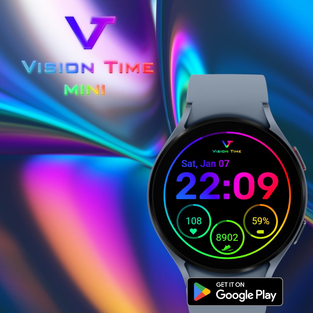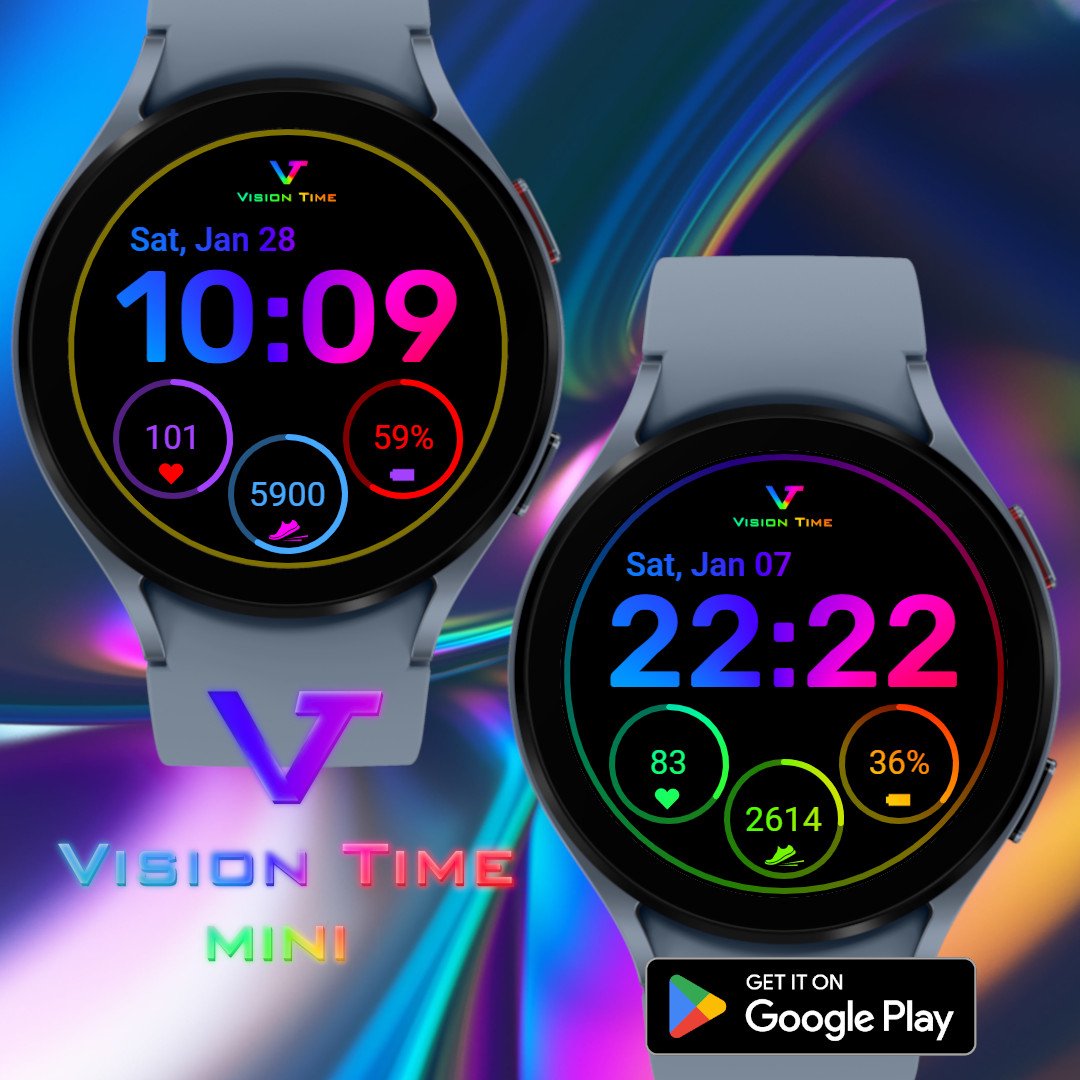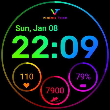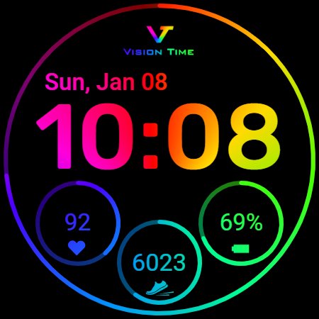 Multicolored watch face with digital clock, date, step counter and heart rate monitor for Wear OS.