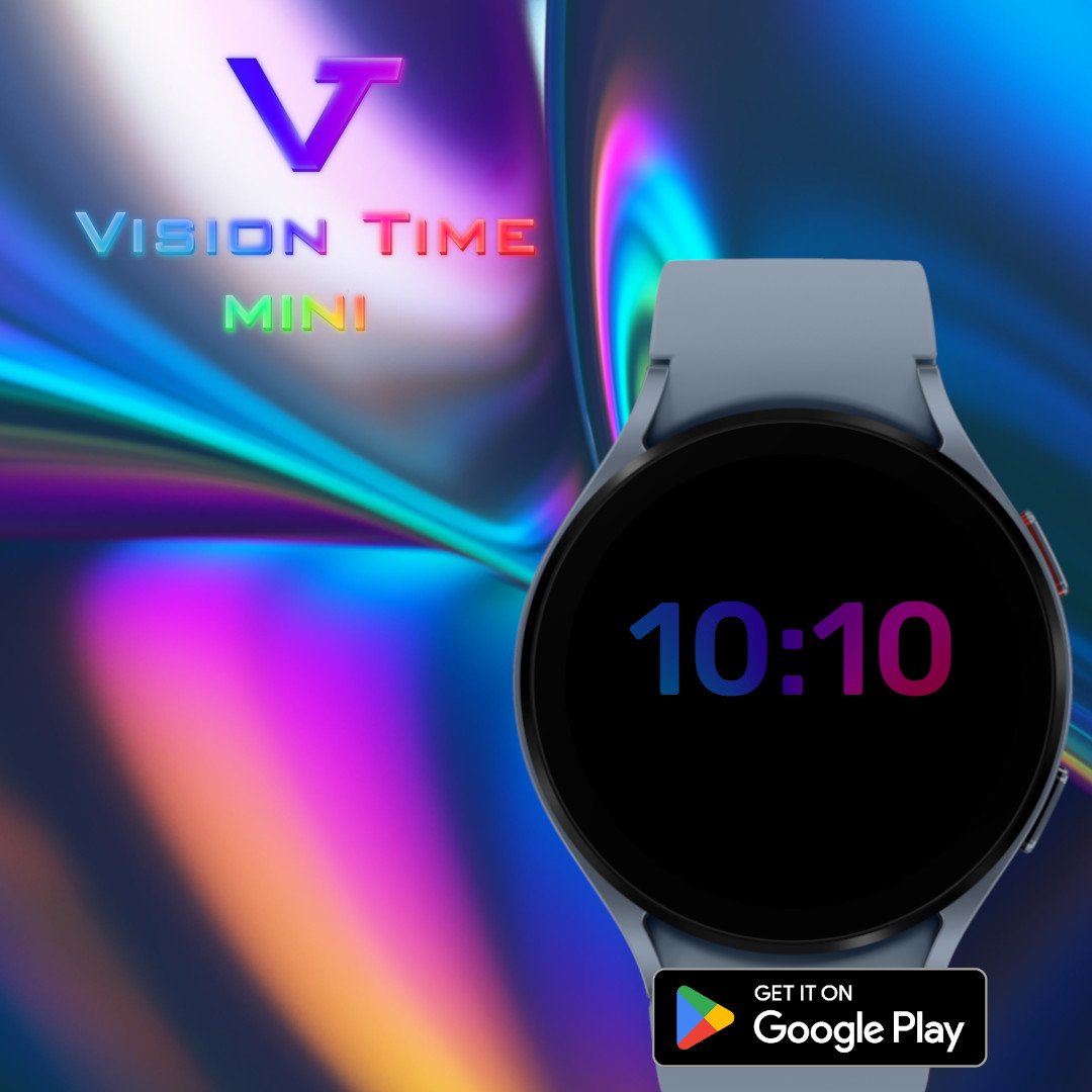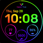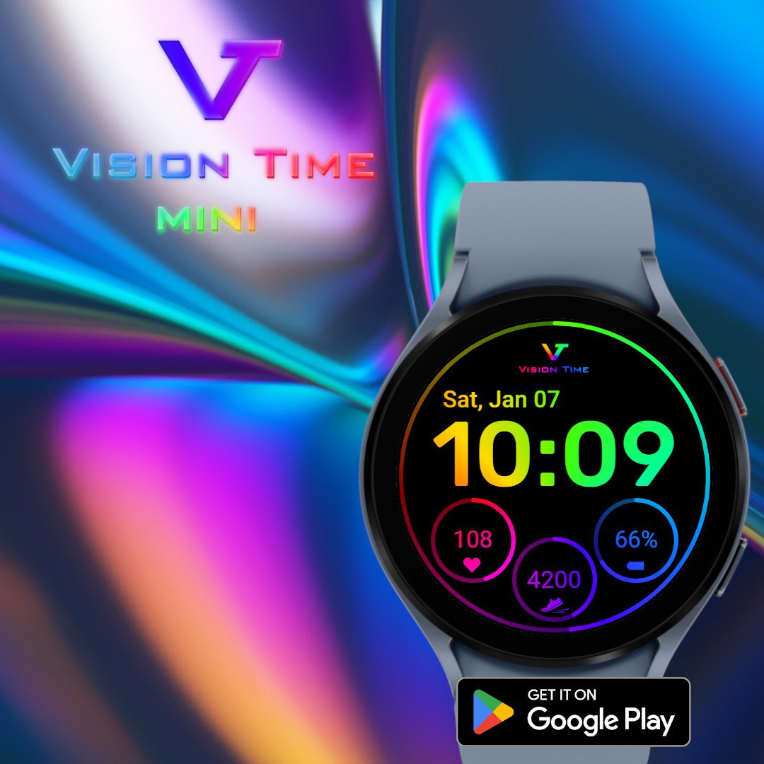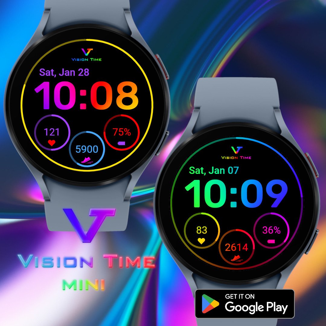 Multicolored watch face with digital clock, date, step counter and heart rate monitor for Wear OS.