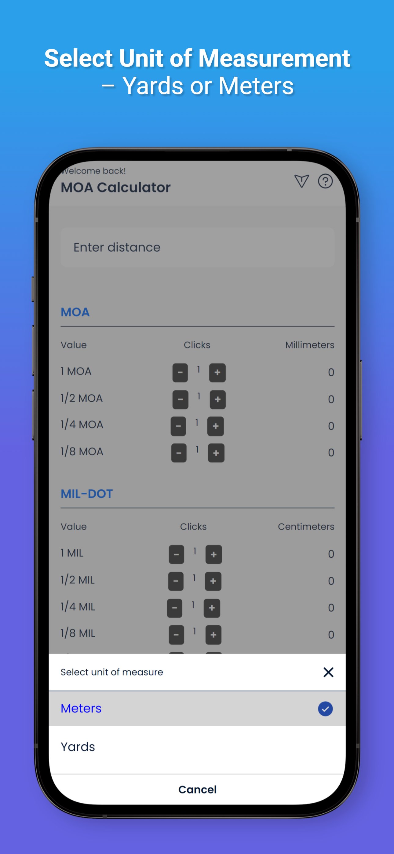 Take the guesswork out of scope adjustments with this easy-to-use MOA & MIL calculator. Whether you're dialing in your rifle for long-range precision or making quick adjustments in the field, this app provides accurate calculations for both Minute of Angle (MOA) and Milliradian (MIL) adjustments based on your selected distance.
