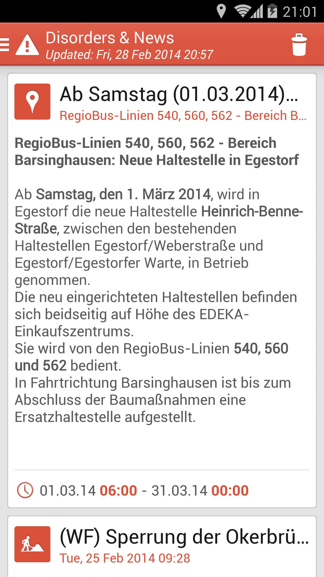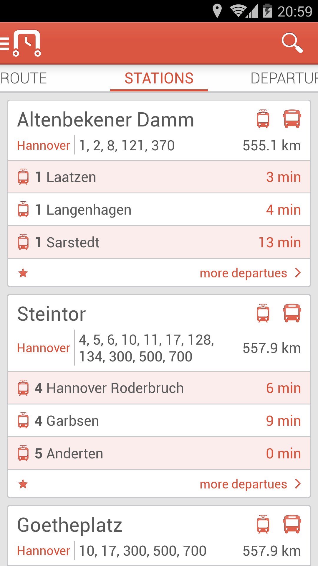 Nextstop provides an information service in real time for all public transport lines of Hannover. The current timetable and information of departure times of all stations are at your hands in no time. Additionally, to allow a better orientation, stations can be displayed on a road map. For route calculation, the departure and destination points can be either stations or positions on the road map. Nextstop shows you your route, from door to door including all footpaths. With nextstop you get important information for your travel all the time and always up to date.