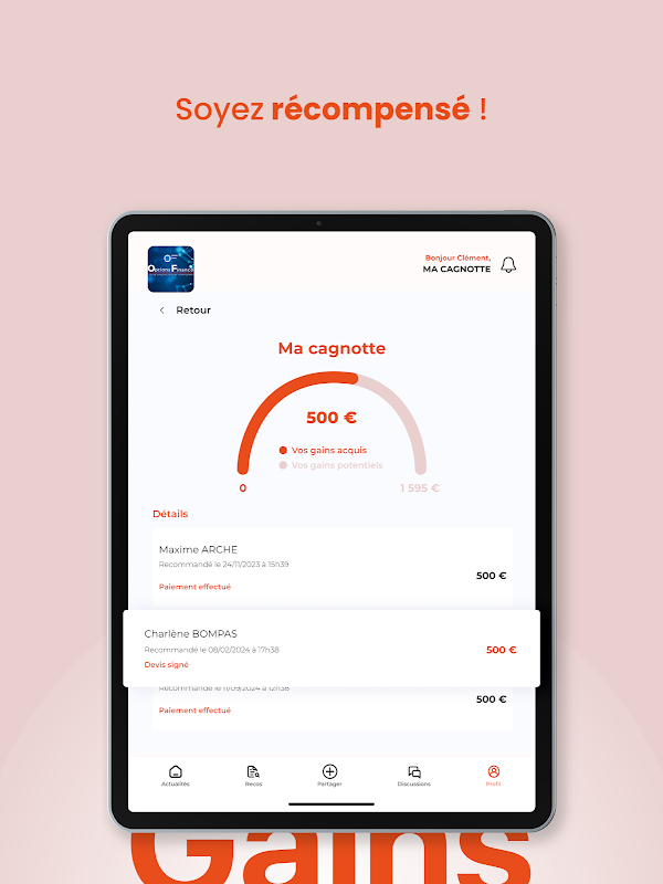 Receive financial compensation by bank transfer for each successful connection from the “Profile” tab.