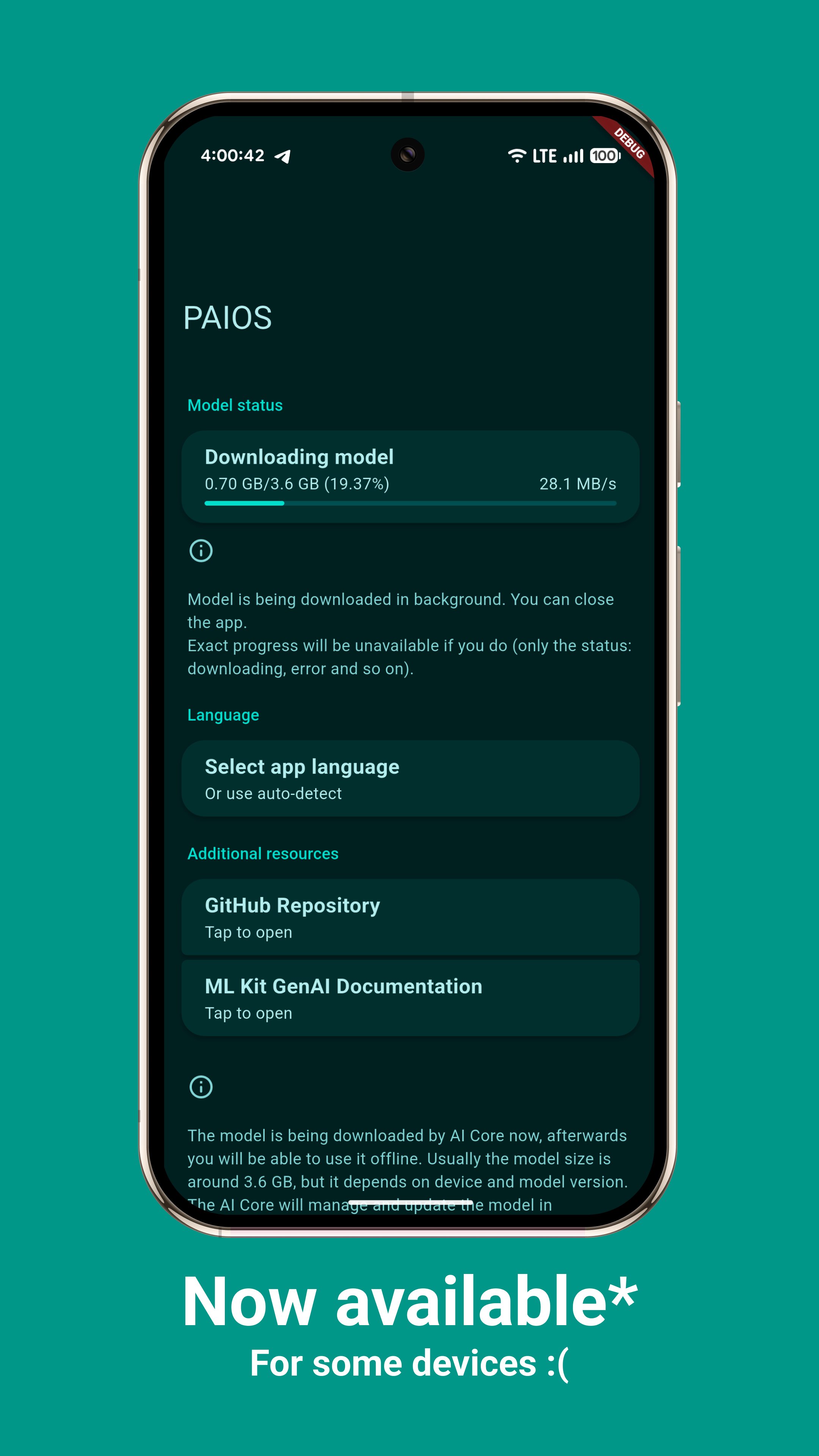 The model requires Google's AI Core, which is currently only available on a very limited number of Android devices. If your device isn't supported, the app will still function, but the AI model would not be there for it. For this reason, the app will not allow the user to explore the app beyond the initiation screen if there is no support for the device.