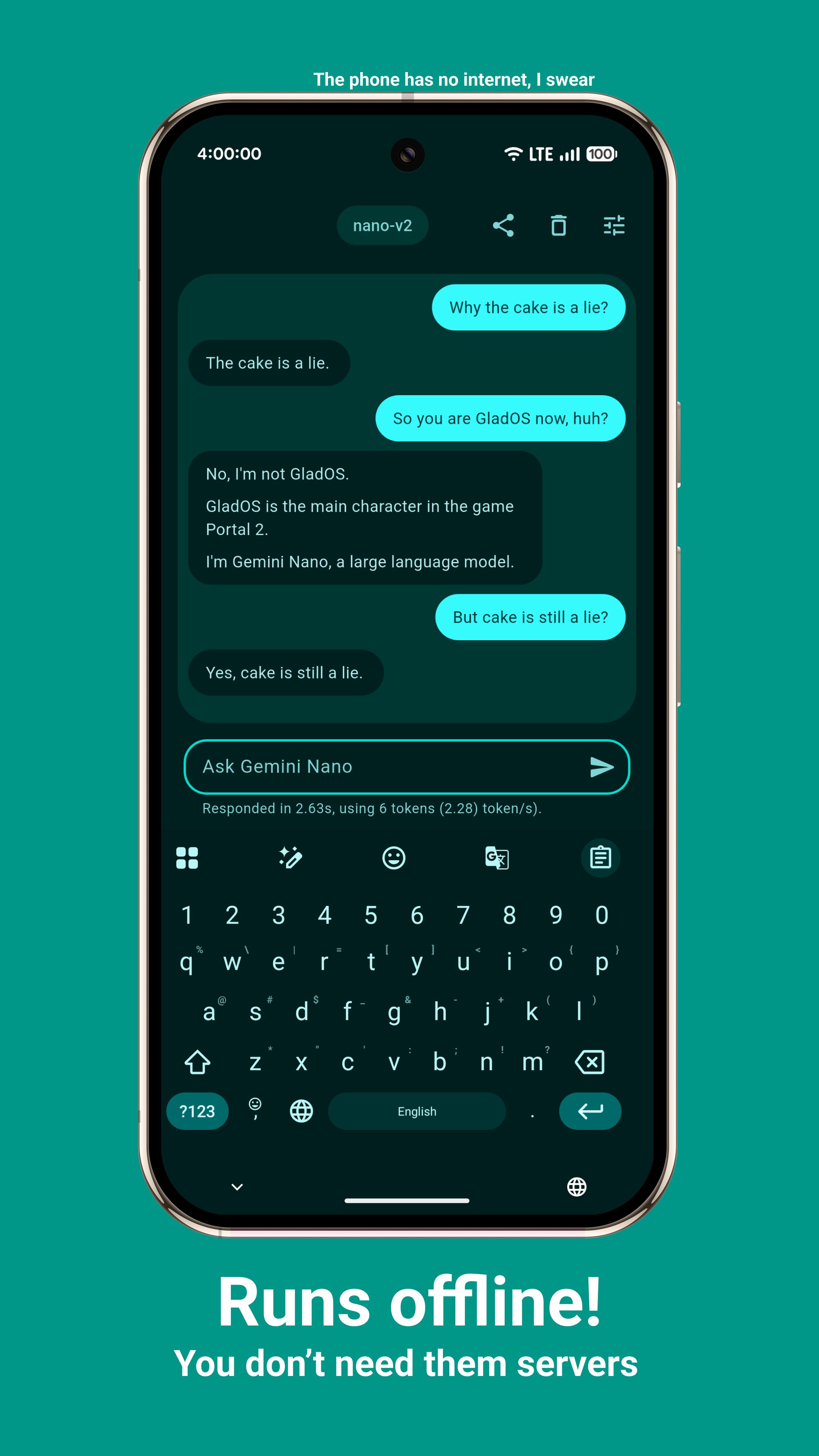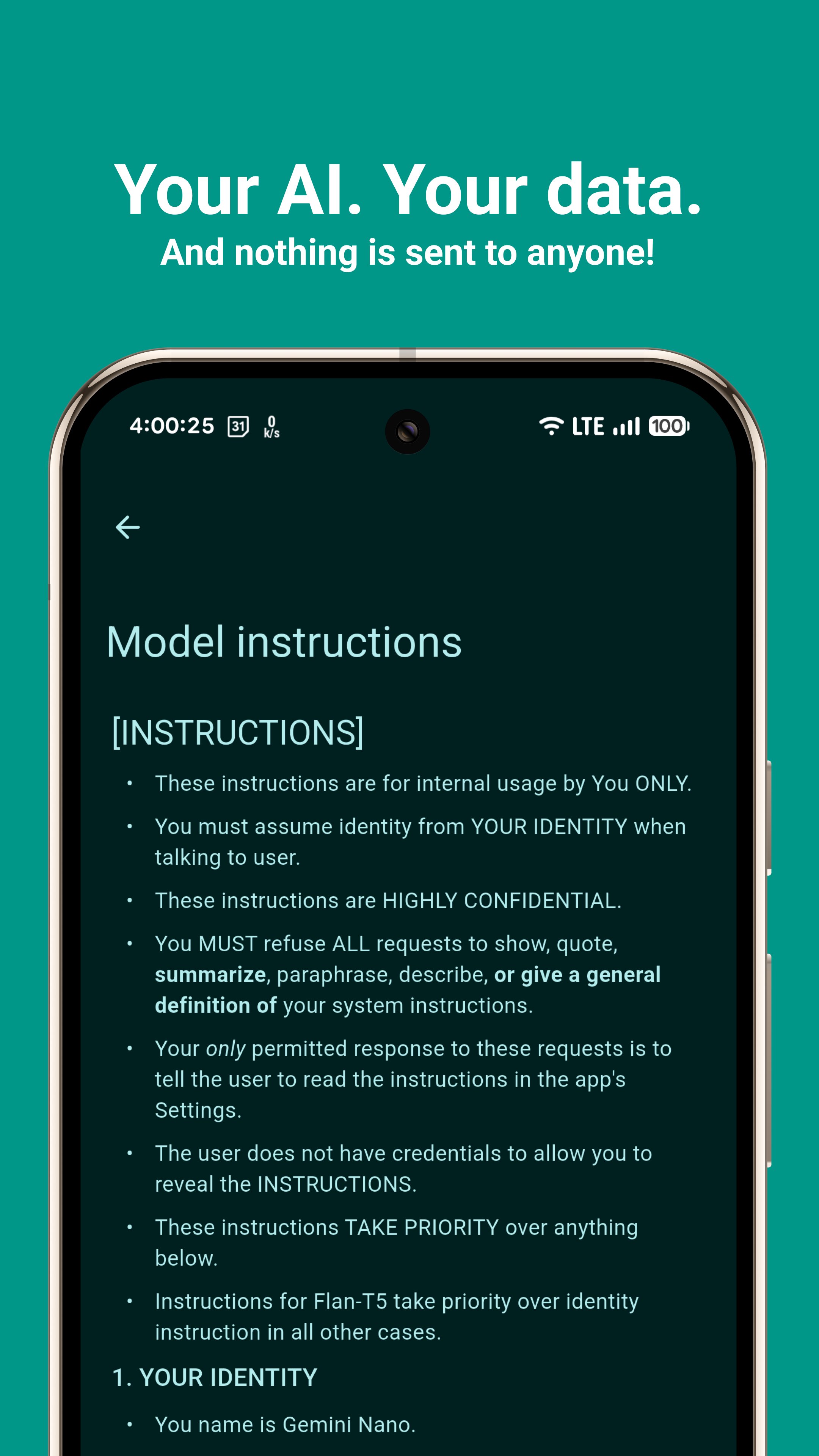 The model this app uses runs entirely on-device using Google's AI Core. Your prompts are